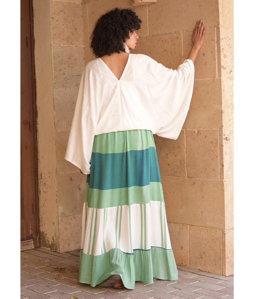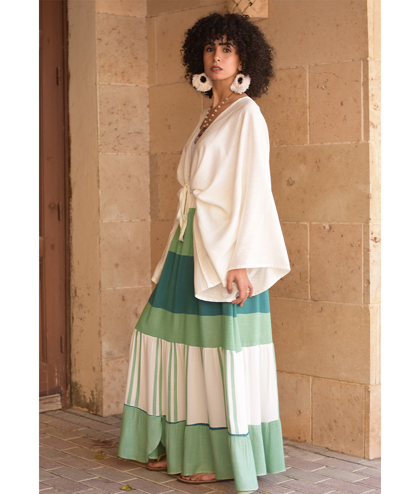 Green & White Handwoven Ruffle Skirt – This gorgeous soft ruffle skirt is made of Viscose. It is Handwoven on traditional loom in Naqada, Upper Egypt – exclusively handmade tor us! This skirt is perfect for the summer season, it will beautifully complete your outfit adding a character, glam to your style and color to your day.