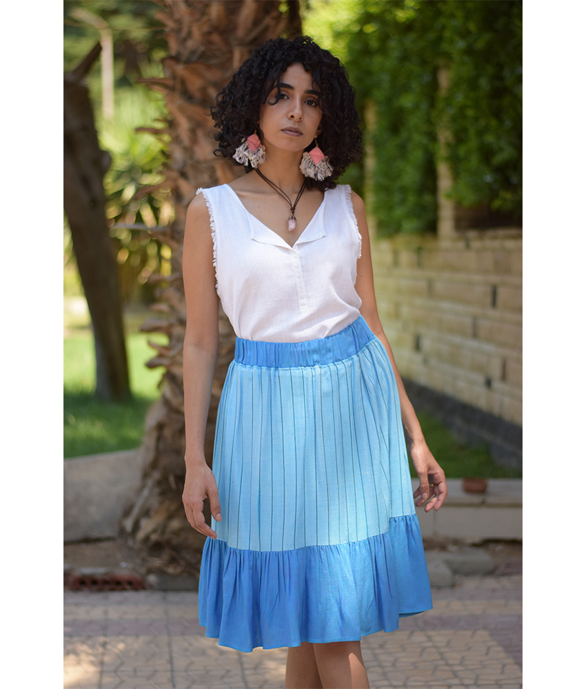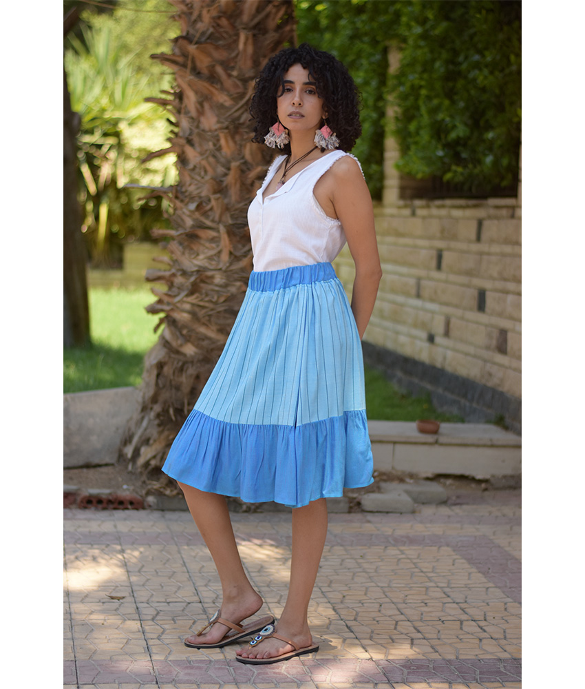 Shades of Blue Handwoven Short Ruffle Skirt – This gorgeous soft ruffle skirt is made of Viscose. It is Handwoven on traditional loom in Naqada, Upper Egypt – exclusively handmade tor us! This skirt is perfect for the summer season, it will beautifully complete your outfit adding a character, glam to your style and color to your day.