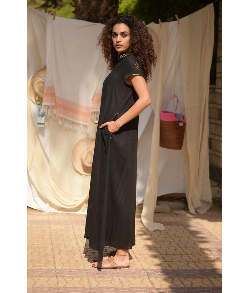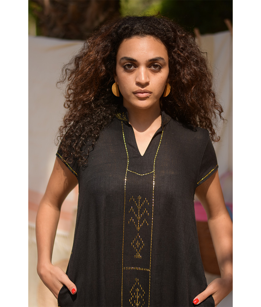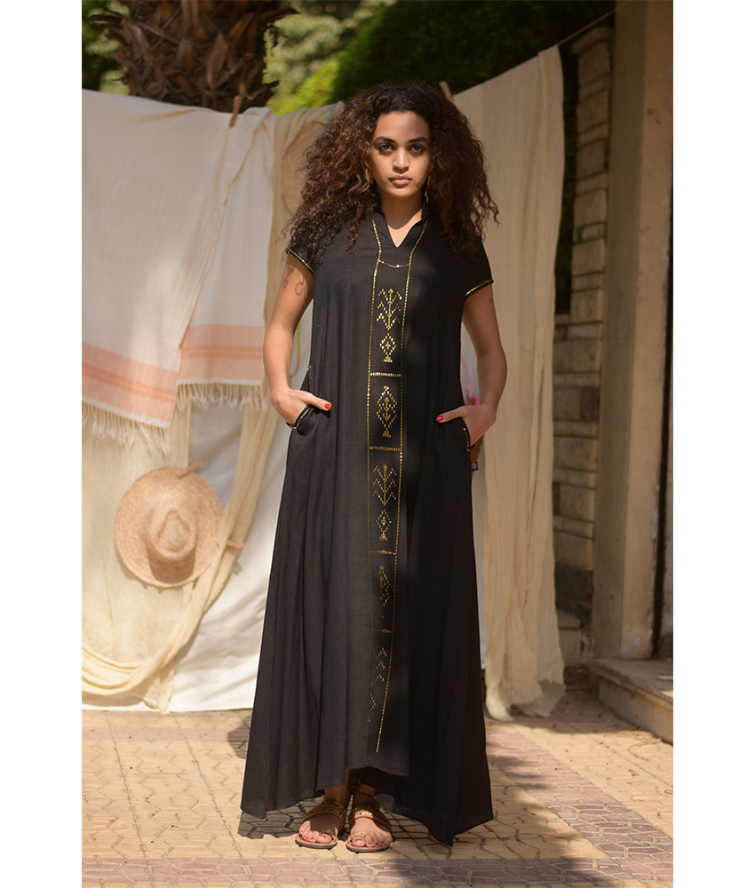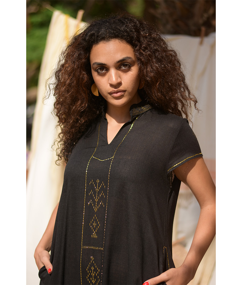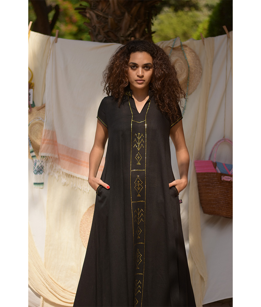 Black Linen Dress with Gold Tally Embroideries