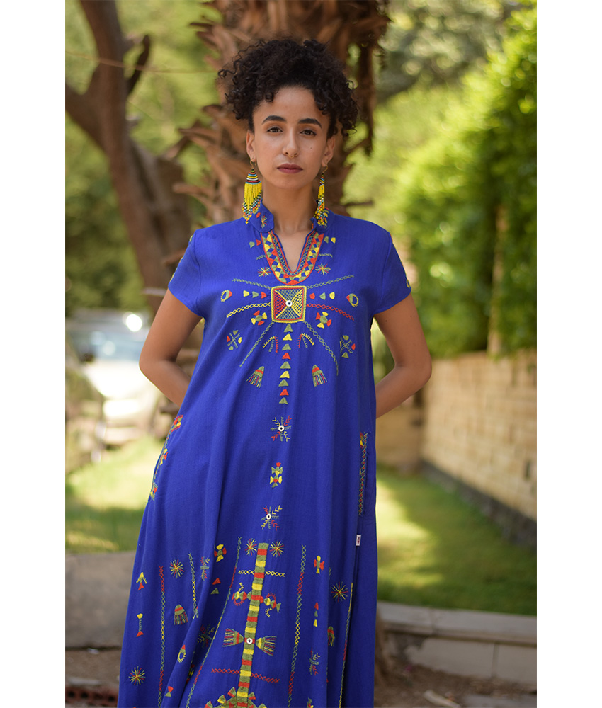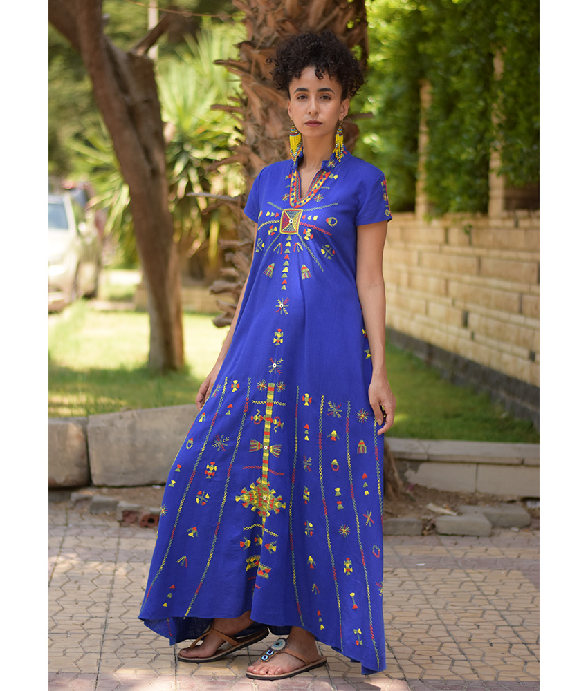 Electric Blue Siwa Embroidered Linen Japanese Dress – Fits Small & Medium