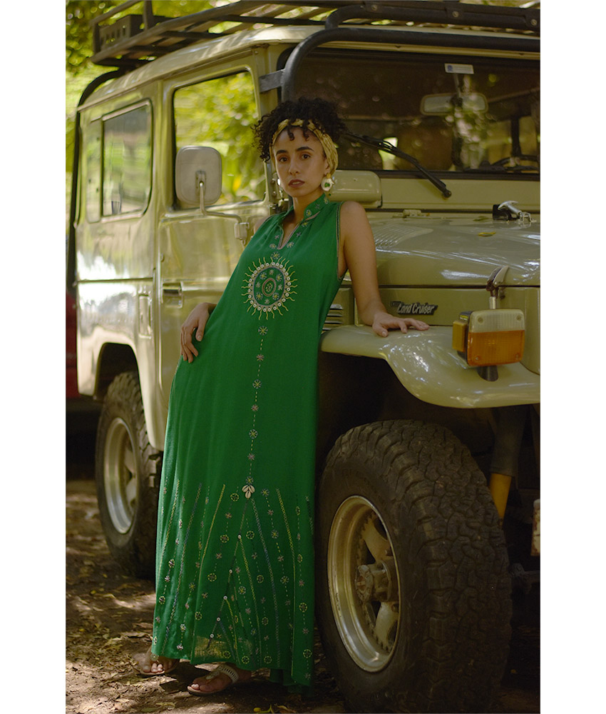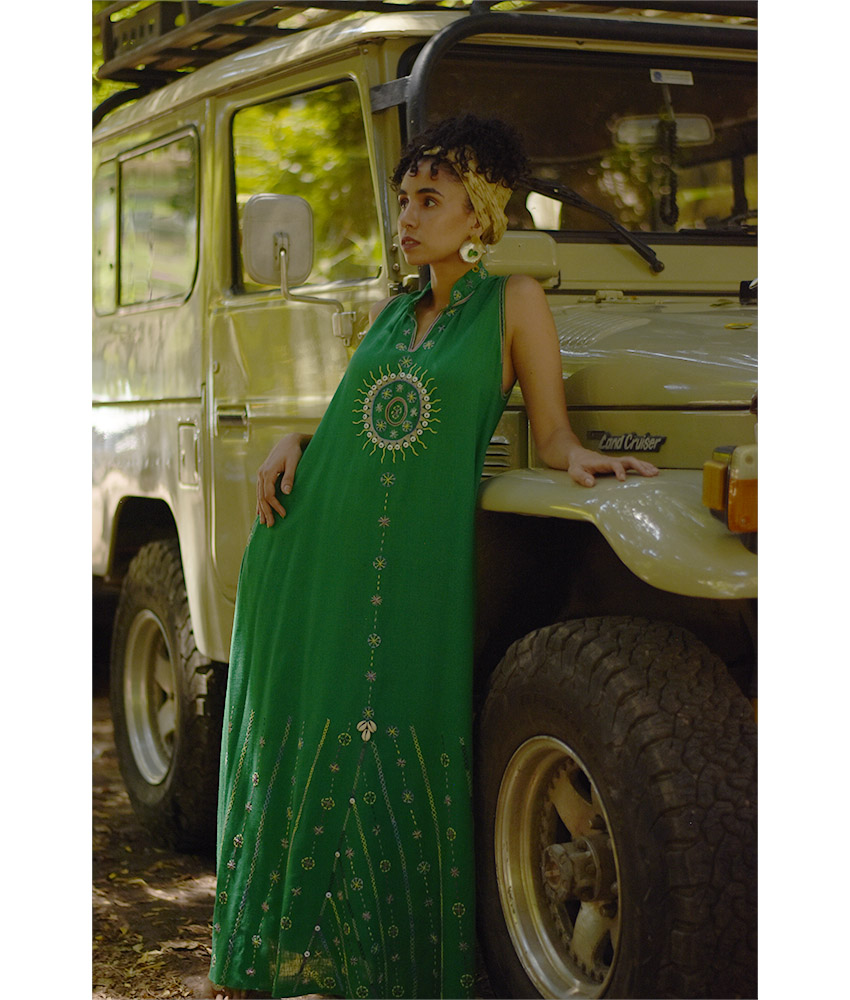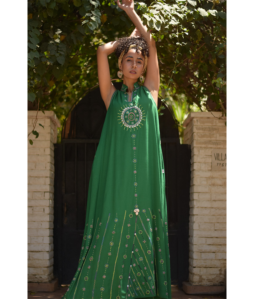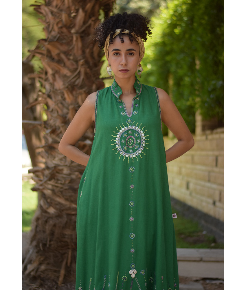 Green Siwa Embroidered Linen Japanese Dress – Fits Small & Medium