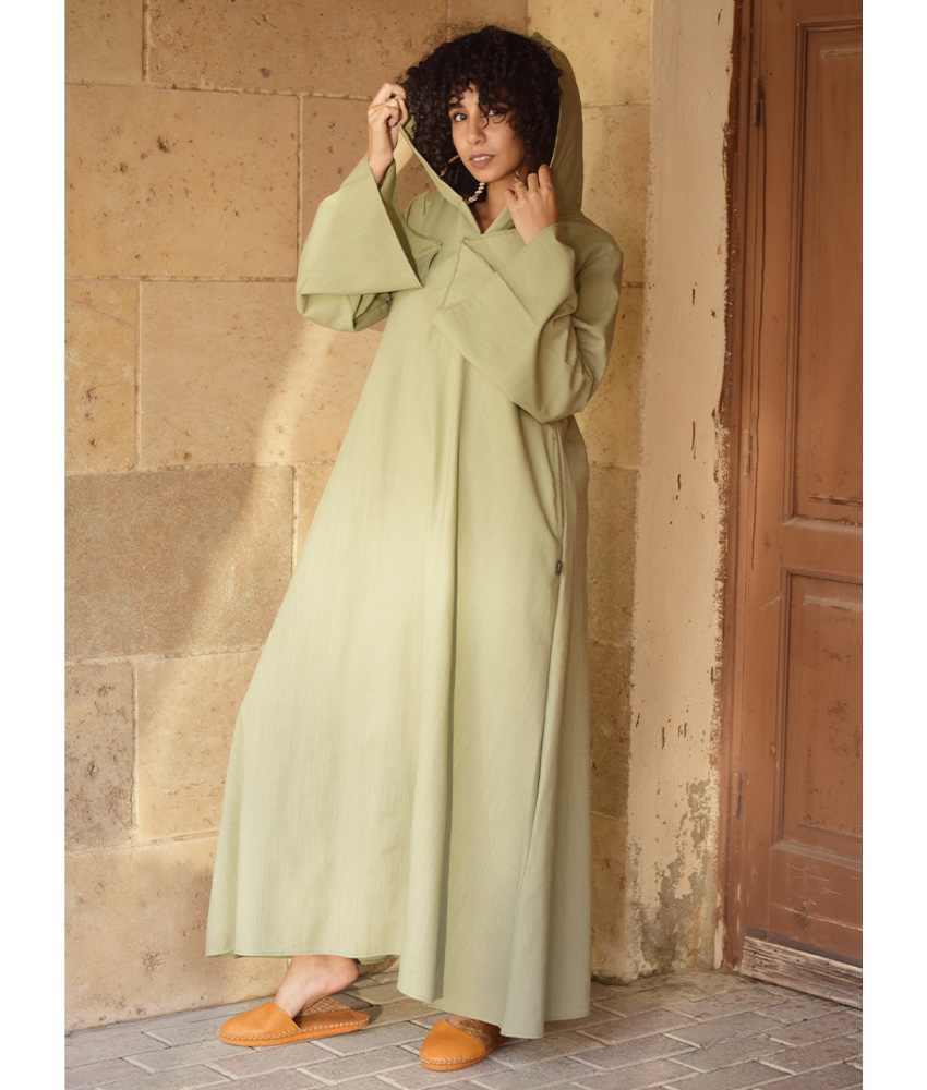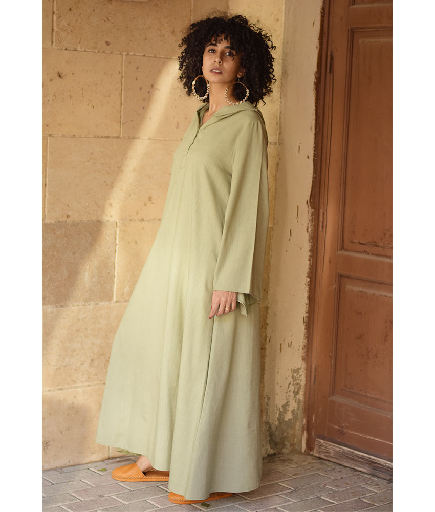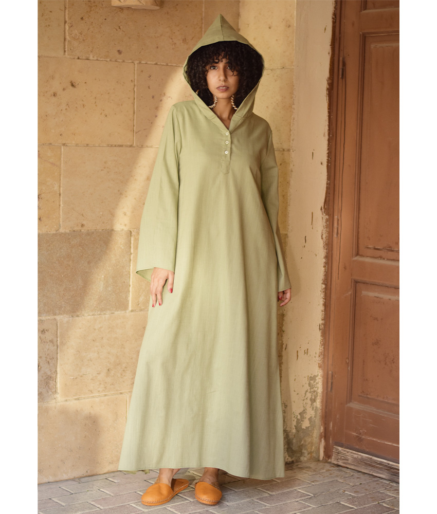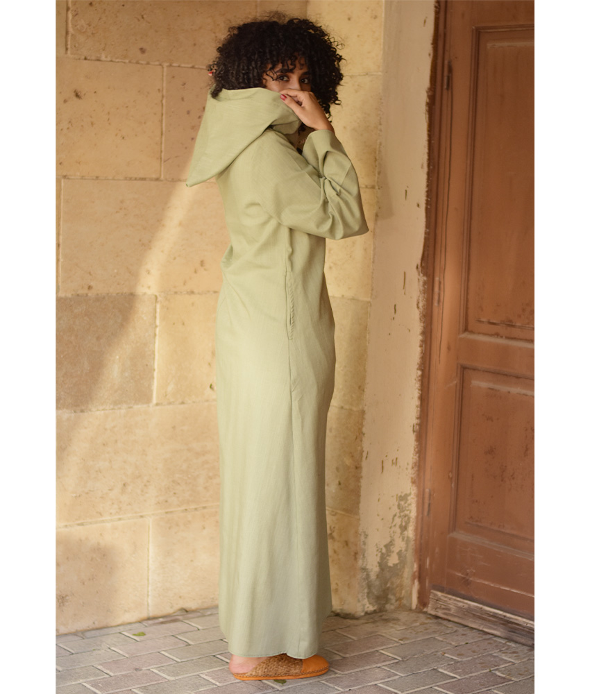 Light Olive Linen Dress with Hoodie – Long Sleeves