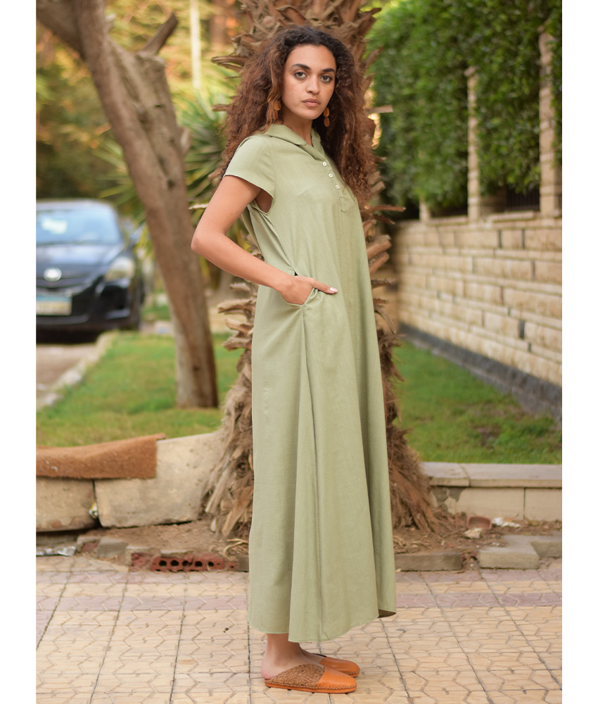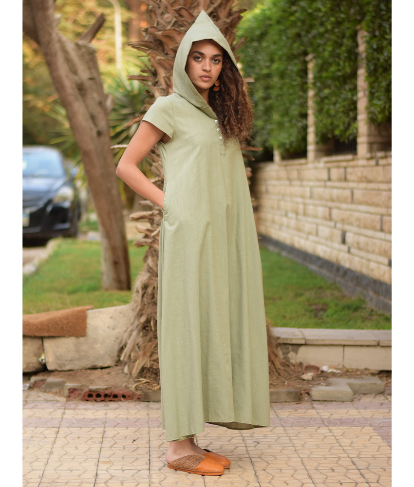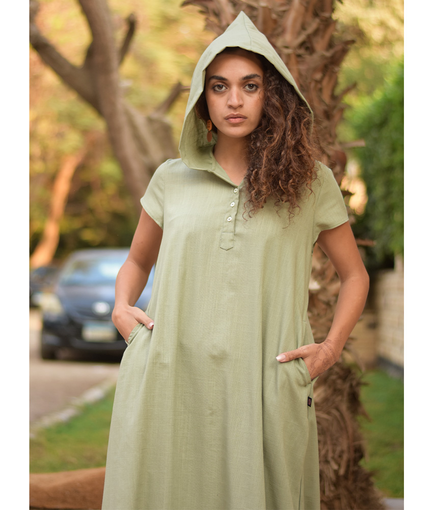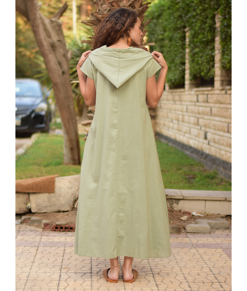 Light Olive Linen Dress with Hoodie – Short Sleeves