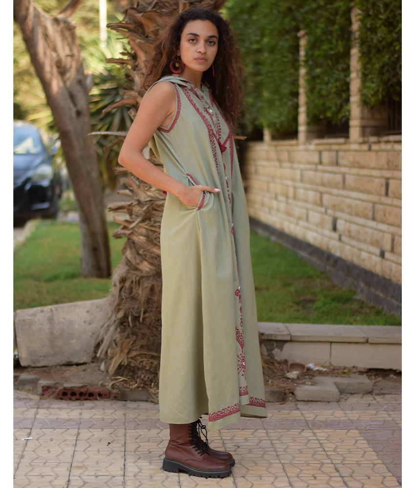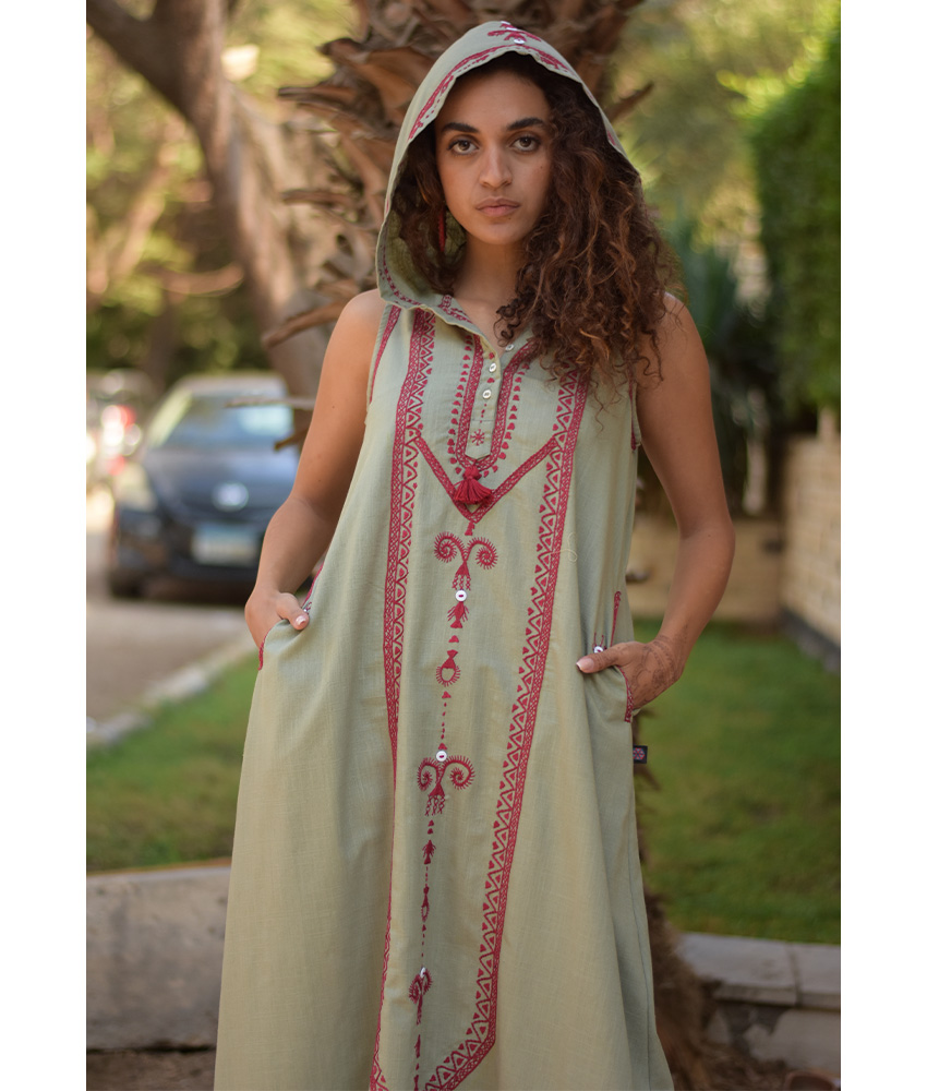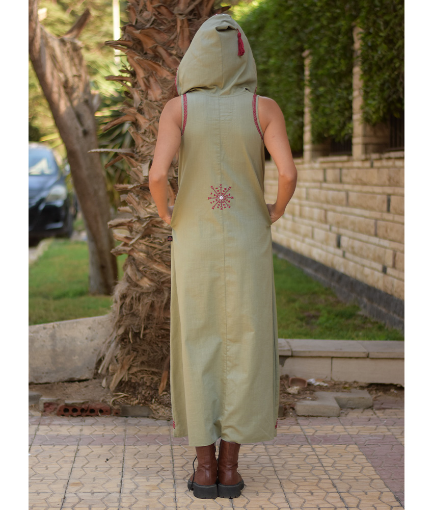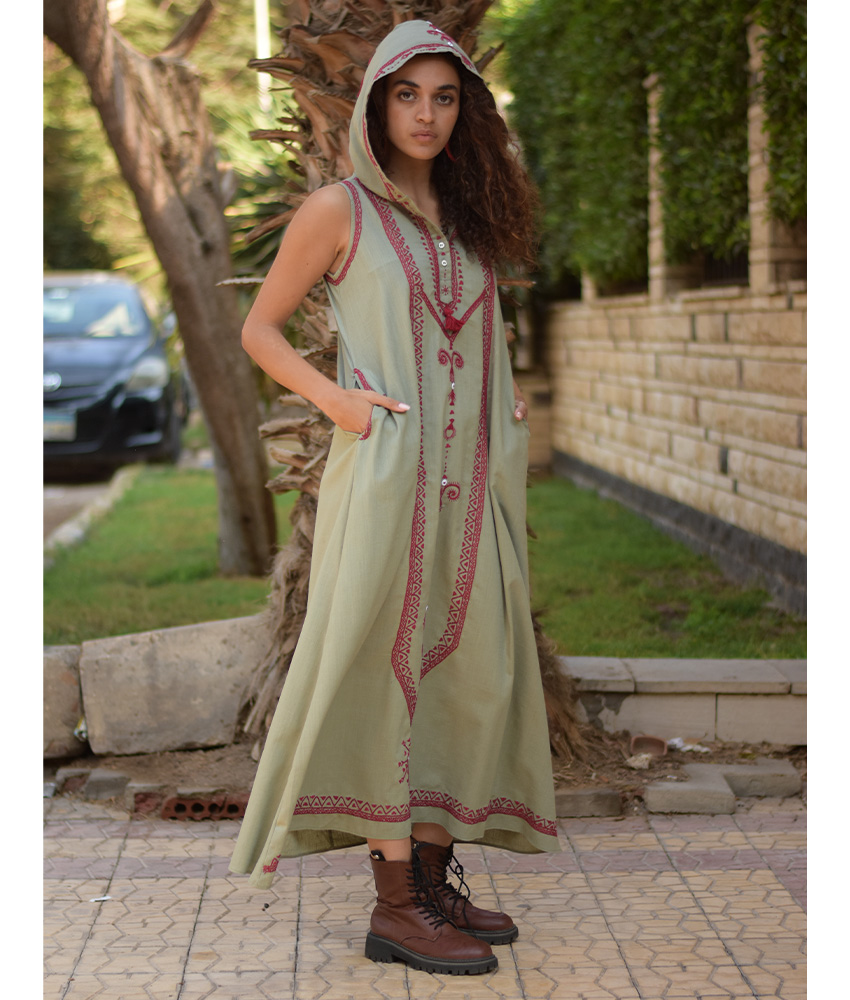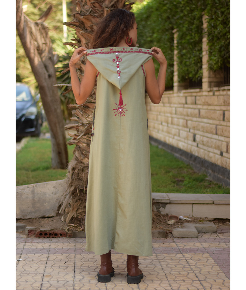 Light Olive Siwa Embroidered Linen Dress with Hoodie