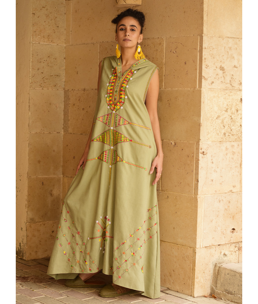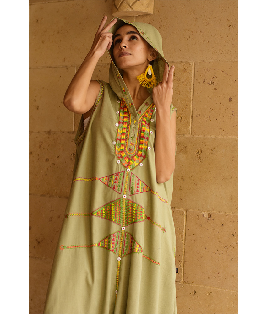 Light Olive Siwa Heavily Embroidered Linen Dress with Hoodie