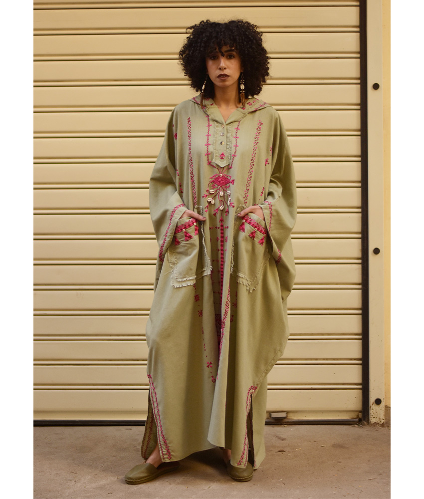 Light Olive Siwa Heavily Embroidered Linen Kaftan with Hoodie – This gorgeous kaftan is made of soft linen. It is adorned with intricate, captivating, and heavy embroideries handmade by the talented women of Siwa. Our cooperation gives them an opportunity to express themselves freely with the needle while helping preserve this beautiful traditional handicraft. You can wear this beautiful kaftan as a dress or pair it with our linen pants or your favorite jeans for a different look.