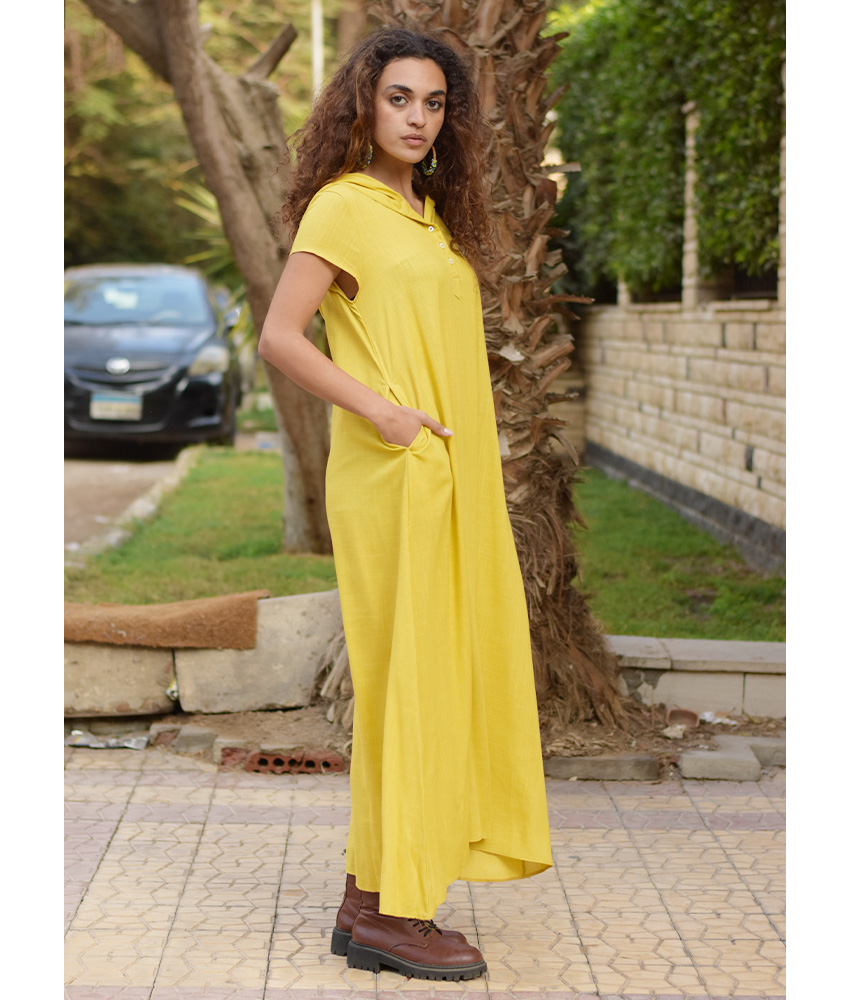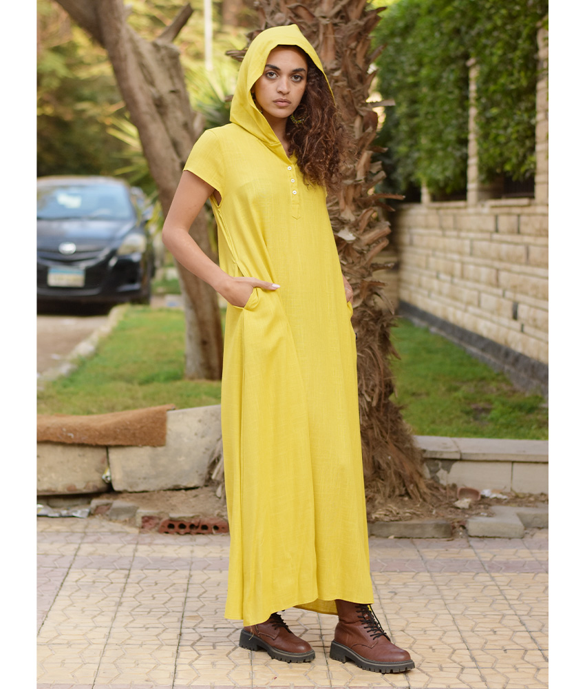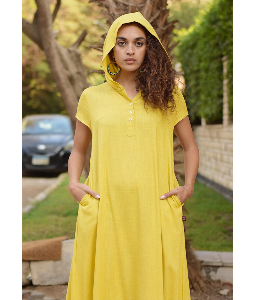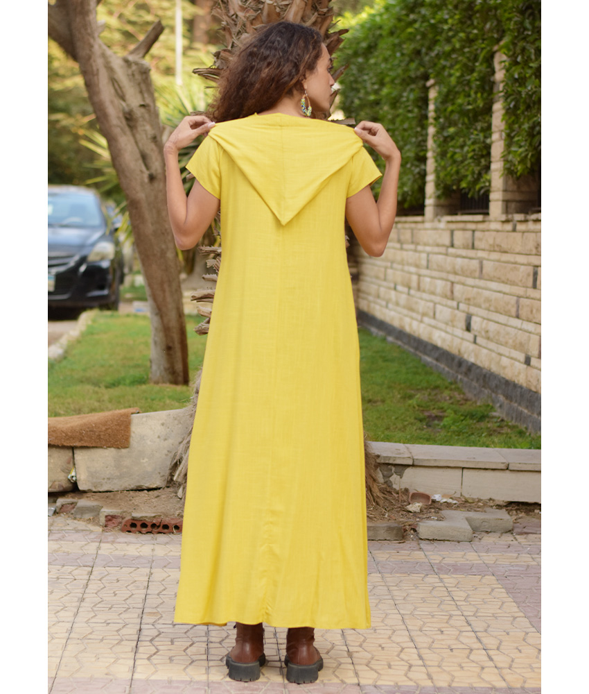 Mustard Linen Dress with Hoodie – Short Sleeves