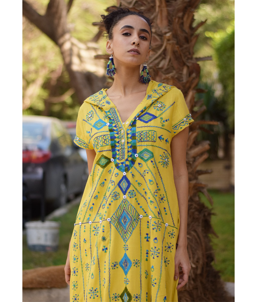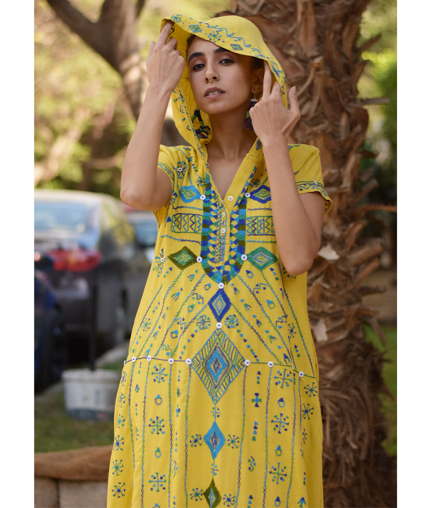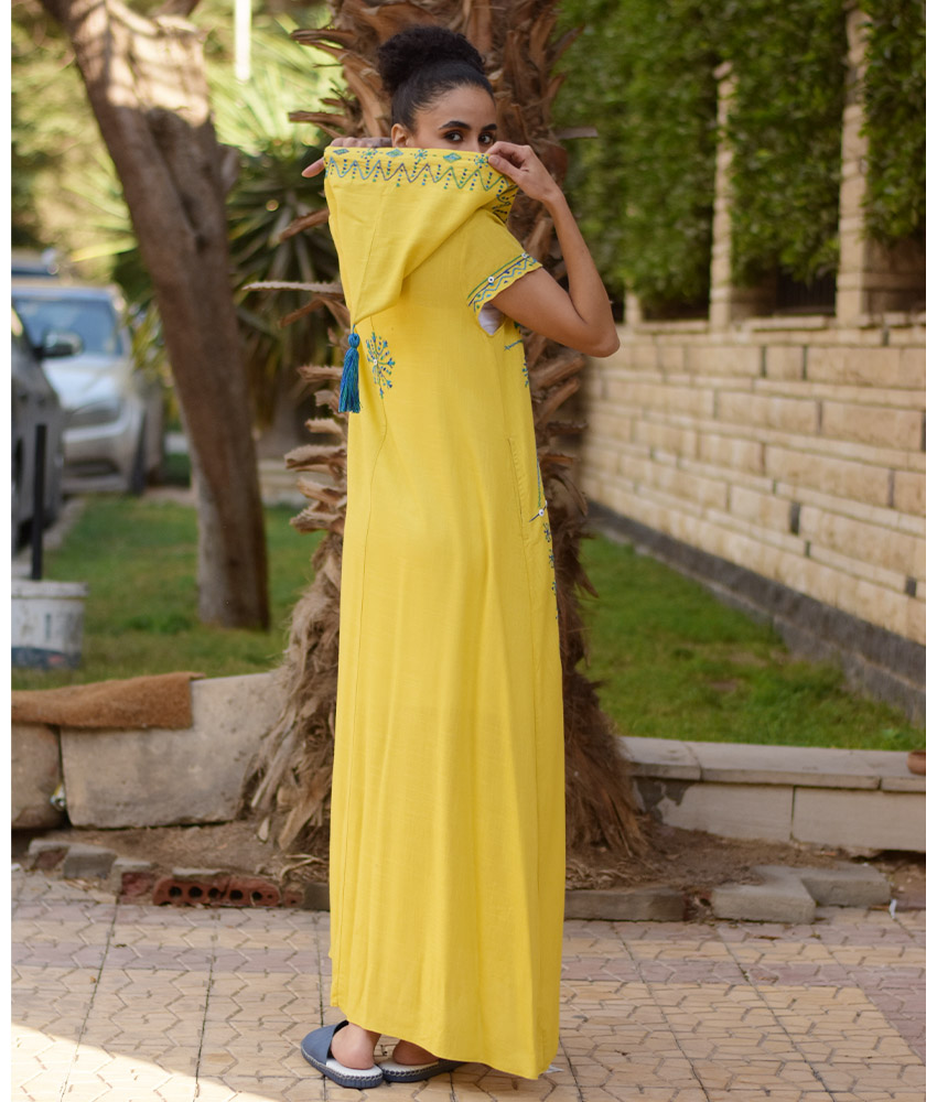 Mustard Siwa Heavily Embroidered Linen Dress with Hoodie – Short Sleeves – Fits Small & Medium