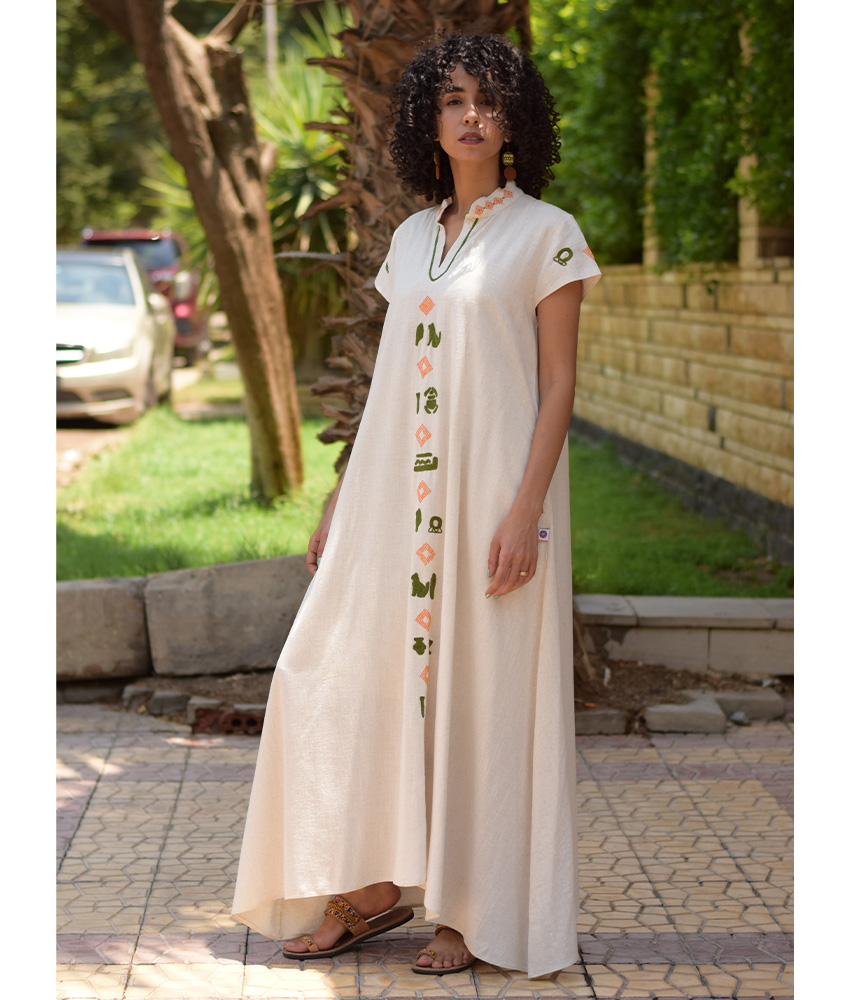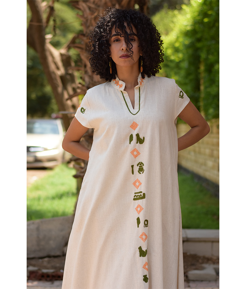 Off White Linen Japanese Dress with Mansag Embroideries