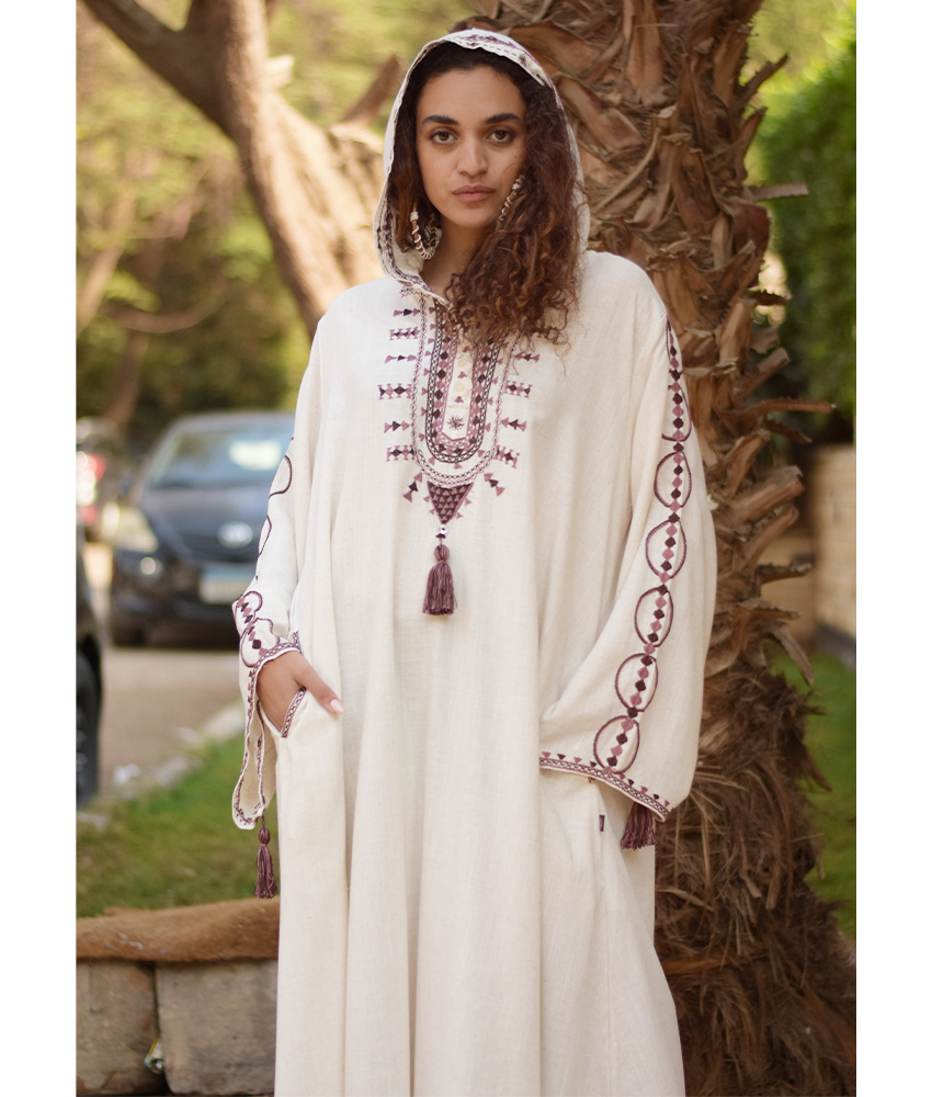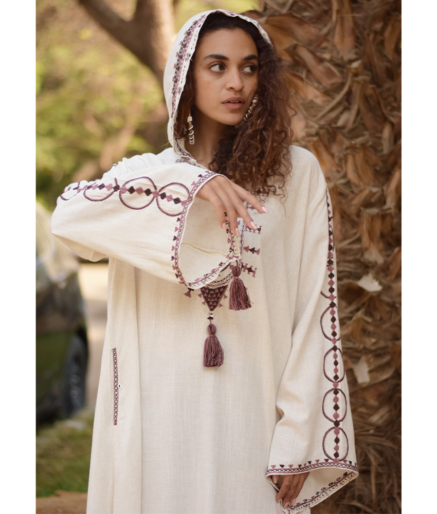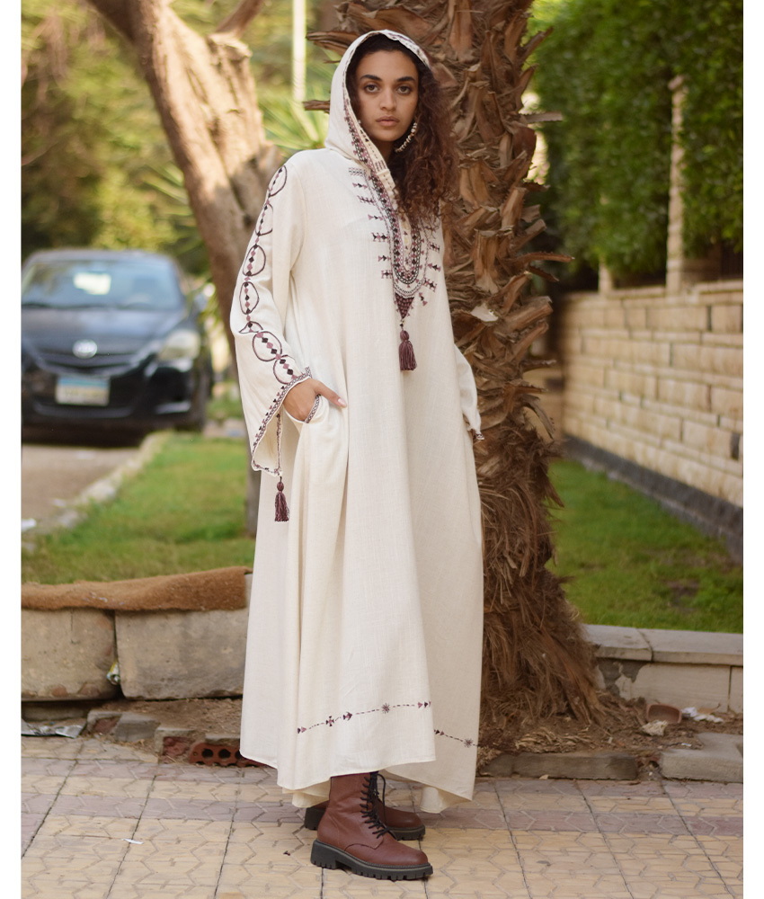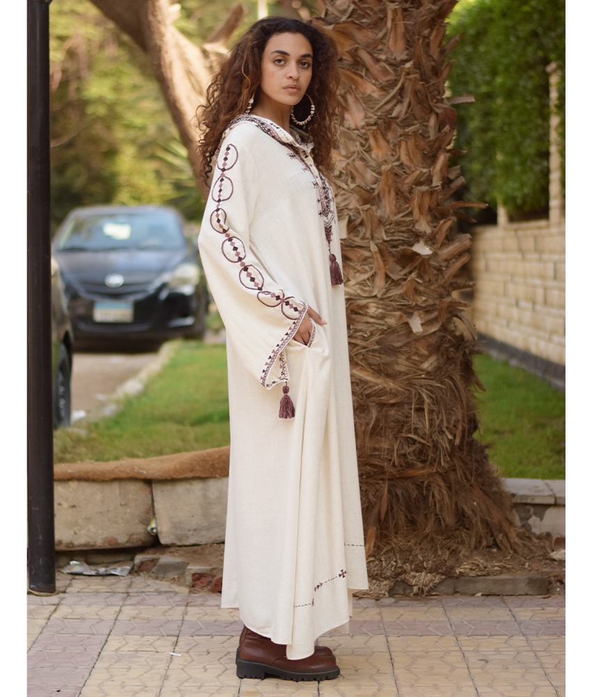 This beautiful dress is made of a linen. This dress is highly desirable because it is very breathable, allows more airflow and is durable. It is adorned with the intricate and captivating embroideries by the hands of the talented women of Siwa. Our cooperation gives them an opportunity to express themselves freely with the needle and helps preserving this beautiful traditional handicraft.