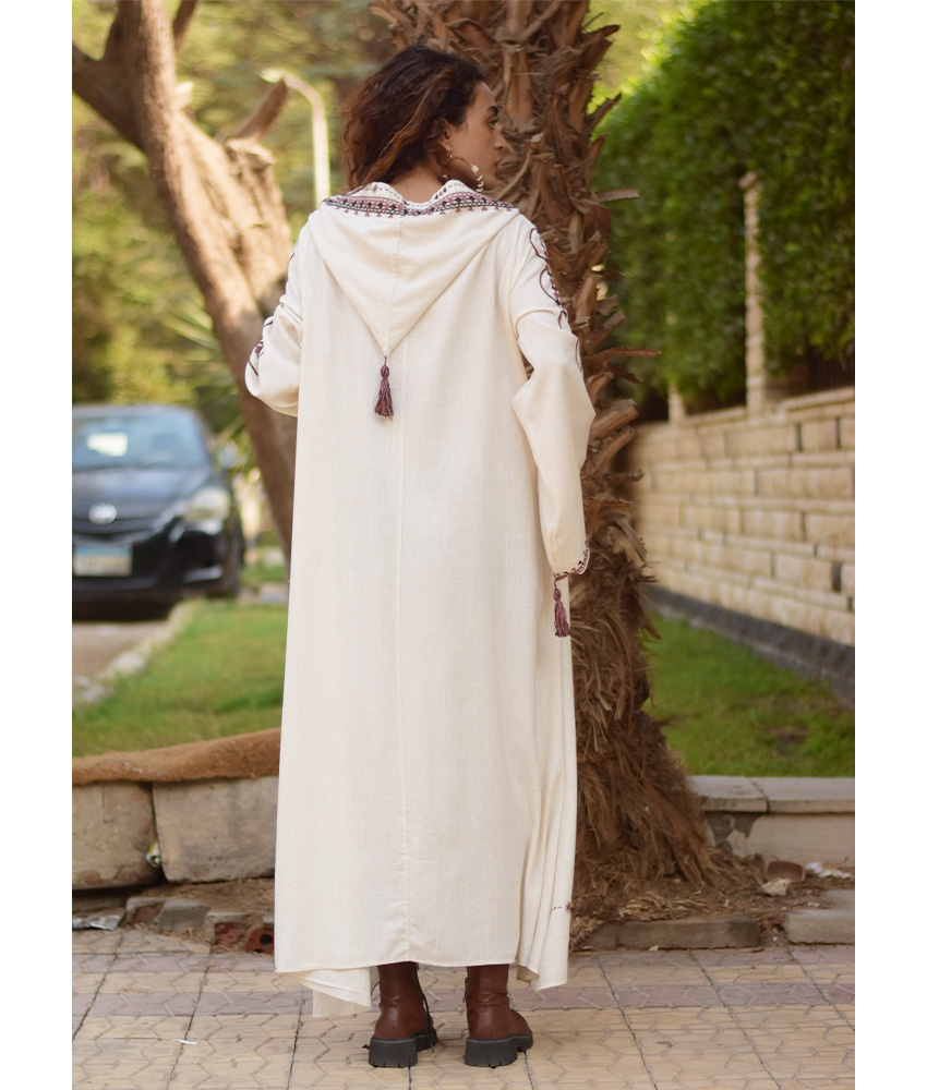 Off White Siwa Embroidered Linen Dress with Hoodie – Long Sleeves – Fits L & XL