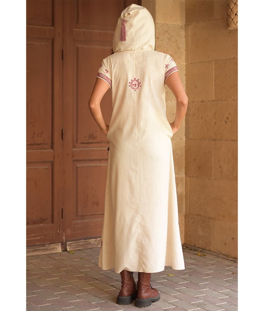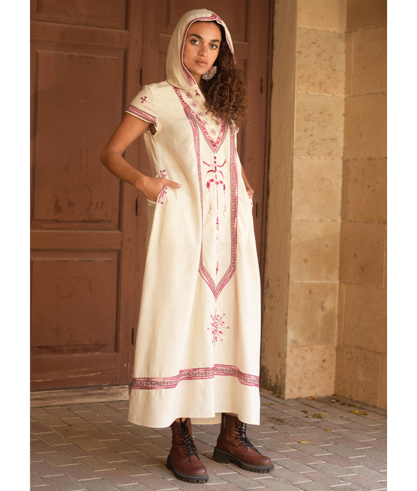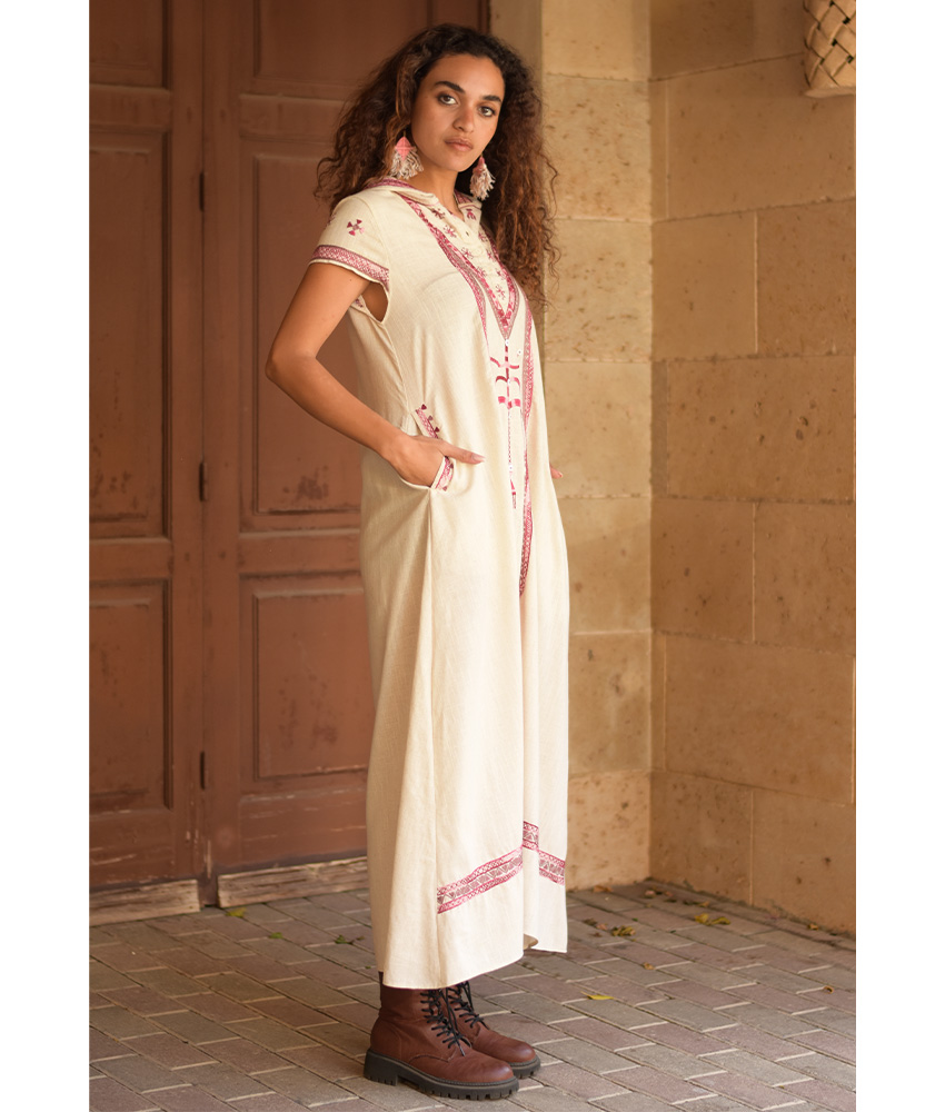 Off White Siwa Embroidered Linen Dress with Hoodie – Short Sleeves – Fits Small & Medium