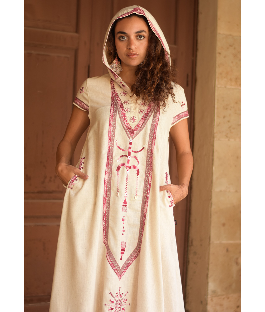 This beautiful dress is made of a linen. This dress is highly desirable because it is very breathable, allows more airflow and is durable. It is adorned with the intricate and captivating embroideries by the hands of the talented women of Siwa. Our cooperation gives them an opportunity to express themselves freely with the needle and helps preserving this beautiful traditional handicraft.