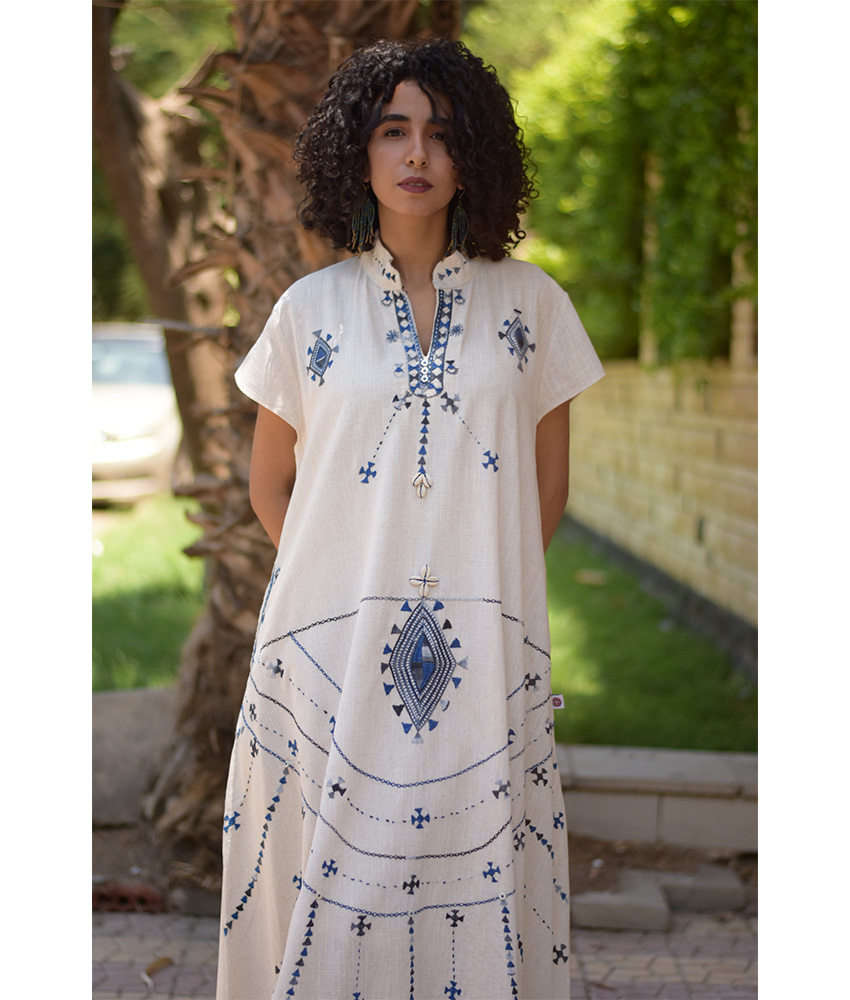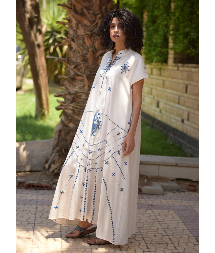 Off White Siwa Embroidered Linen Japanese Dress – Fits L & XL