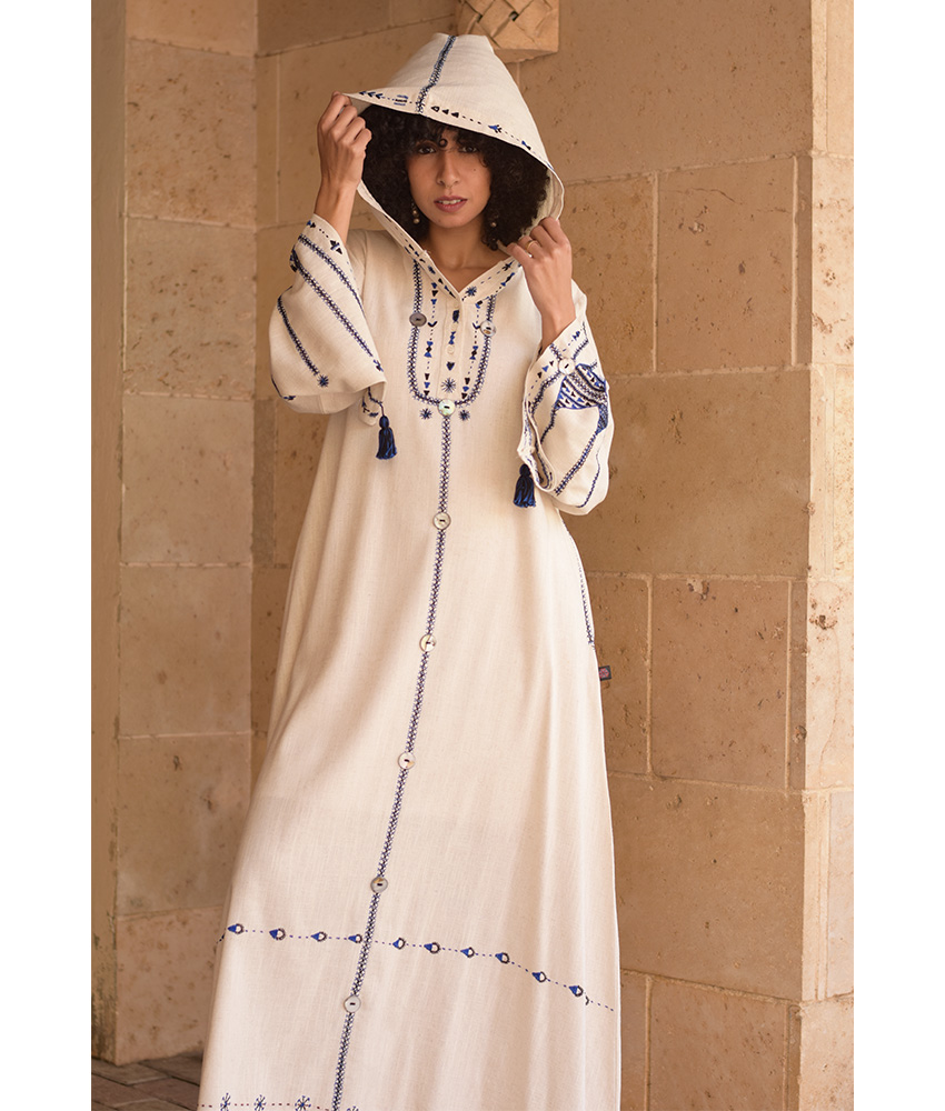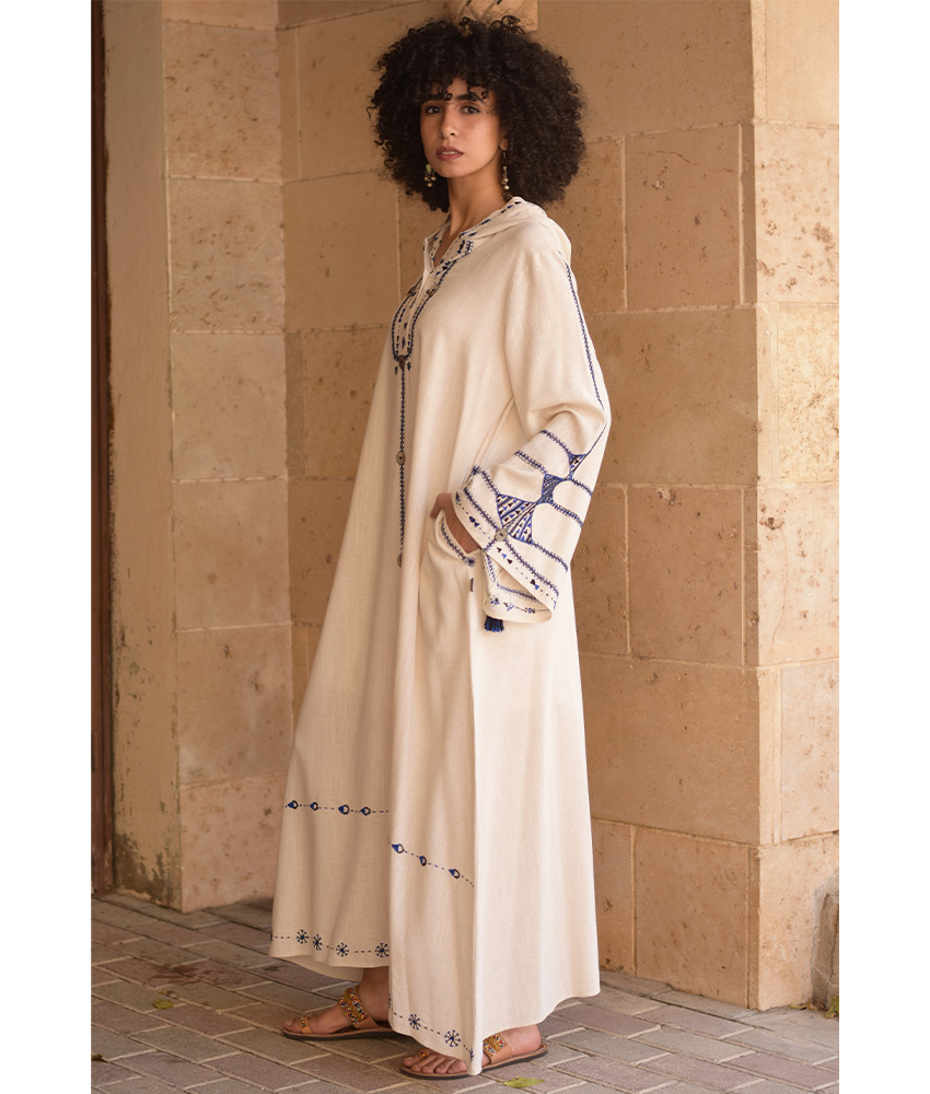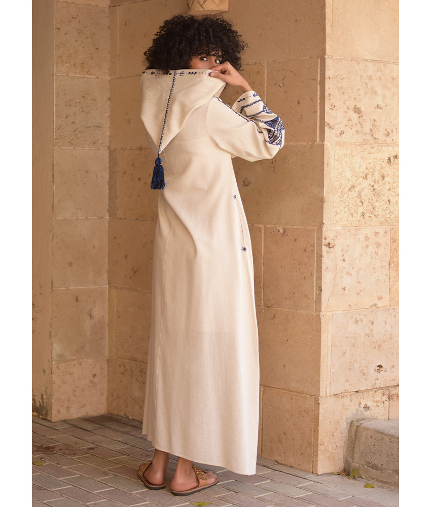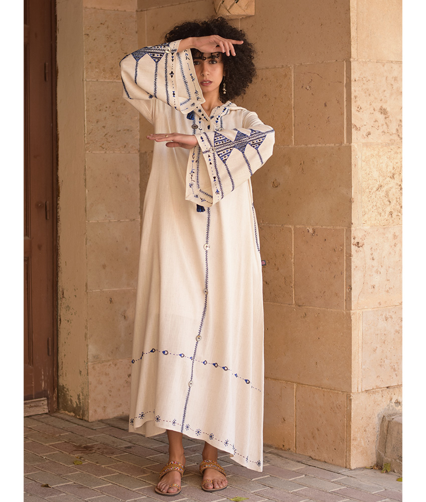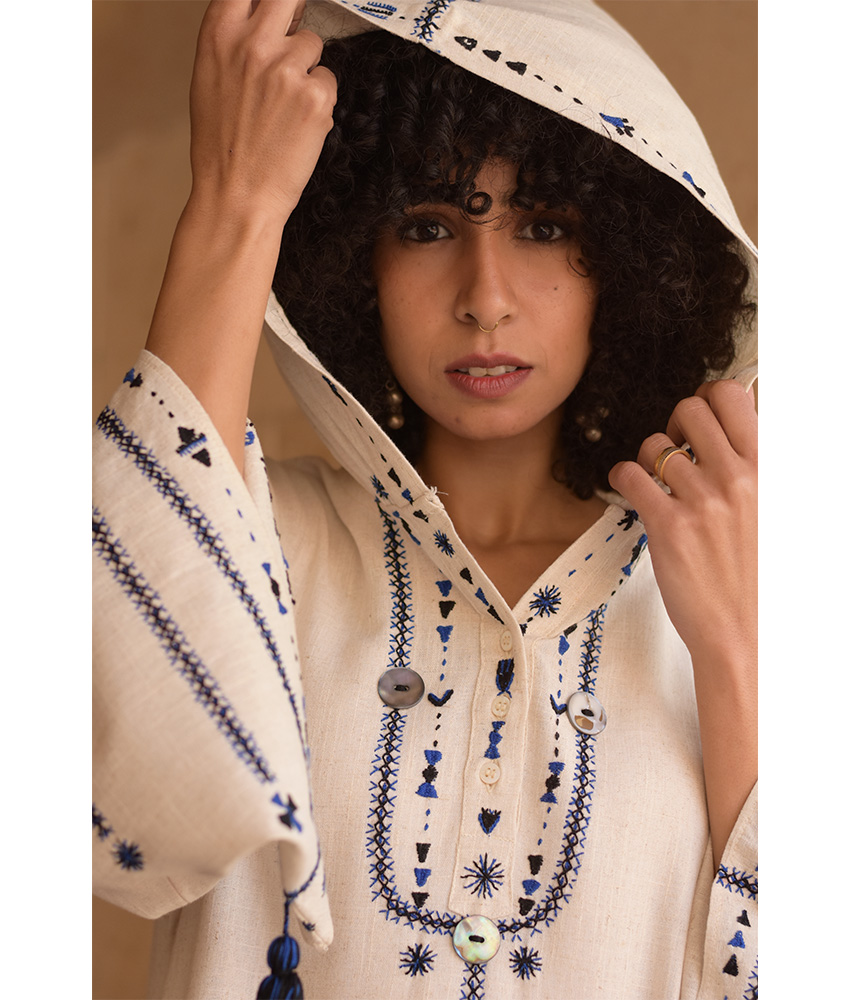 Off White Siwa Heavily Embroidered Linen Dress with Hoodie