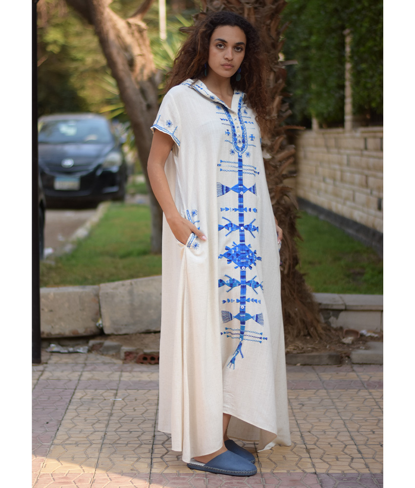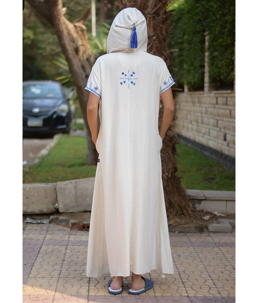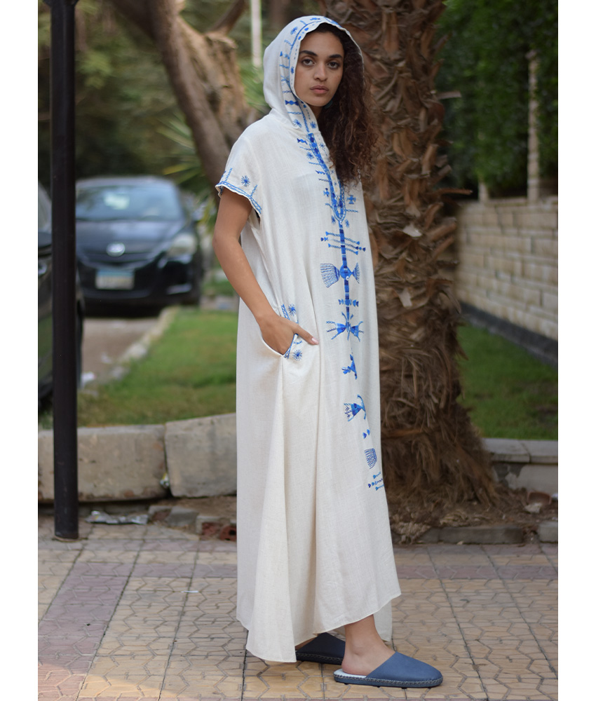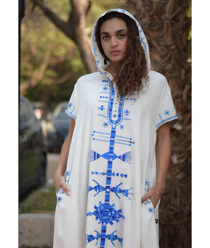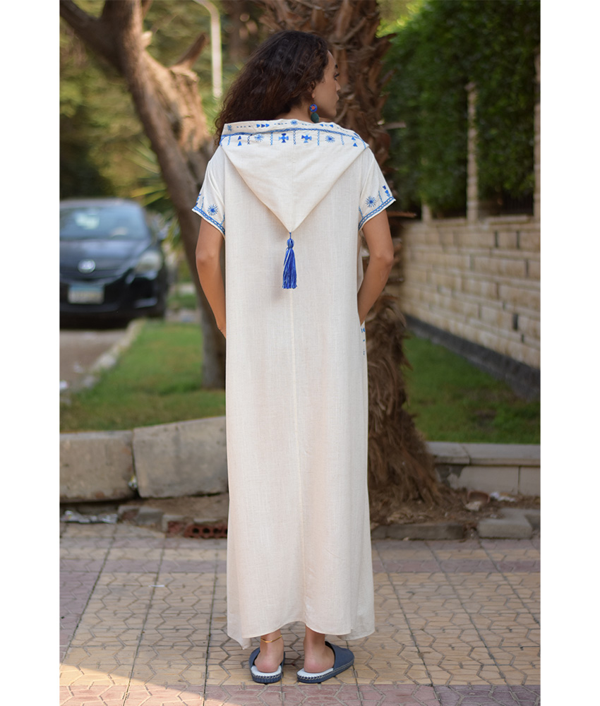 White Siwa Heavily Embroidered Linen Dress with Hoodie