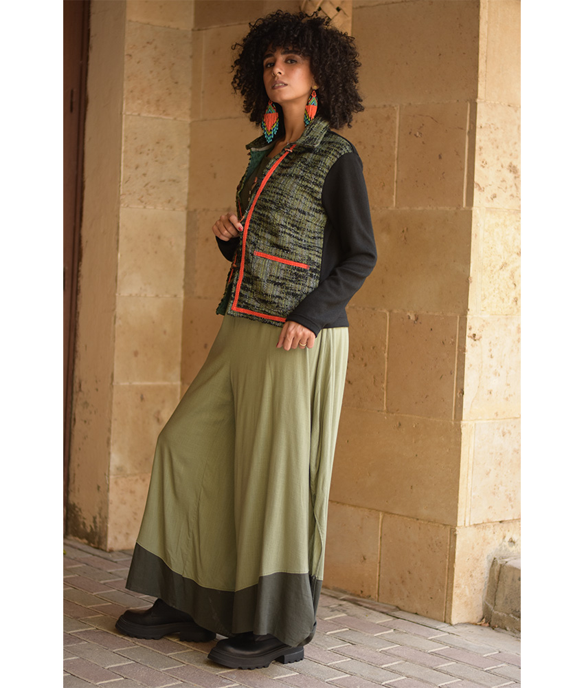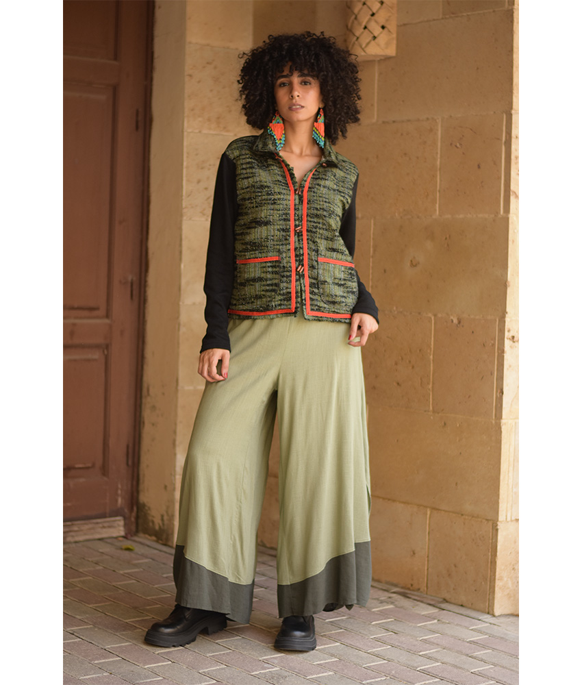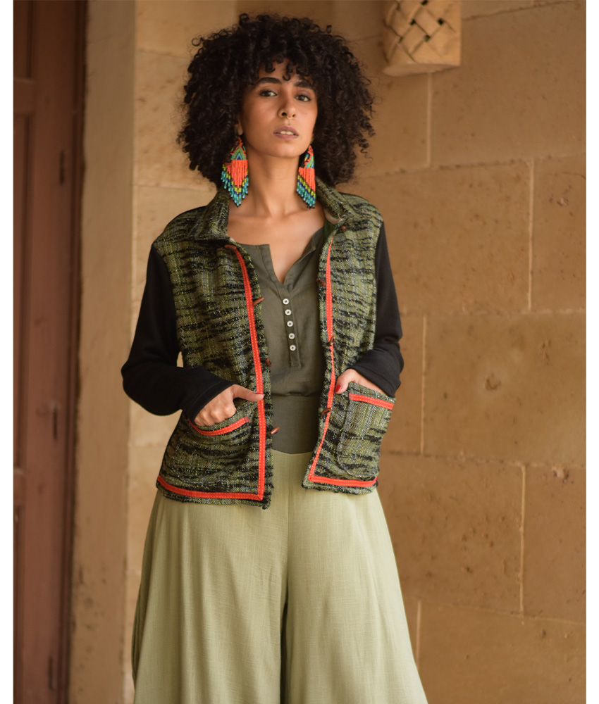 Black & Green Cropped Akhmim Loomwoven Jacket – A modern cropped layer crafted from Akhmim loom-woven velour, cotton & wool with a soft, flexible back panel for ease and all-day comfort. Light yet warming, it’s your go-to for work, weekends, and travel.