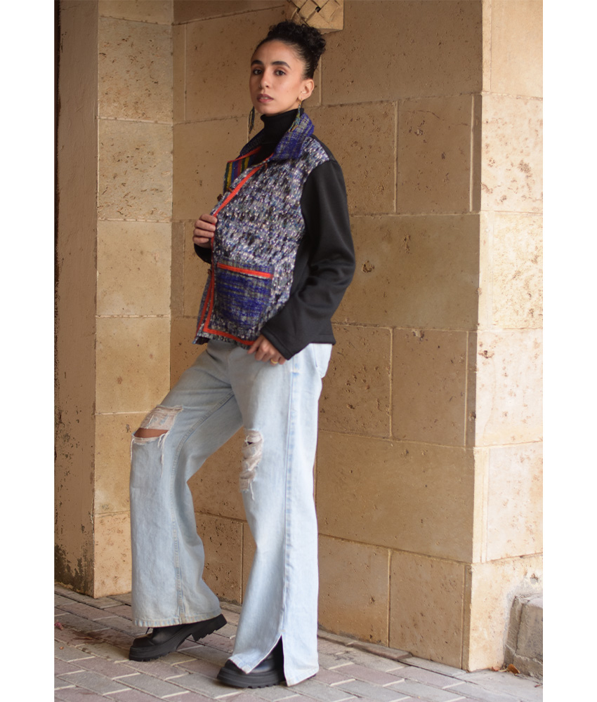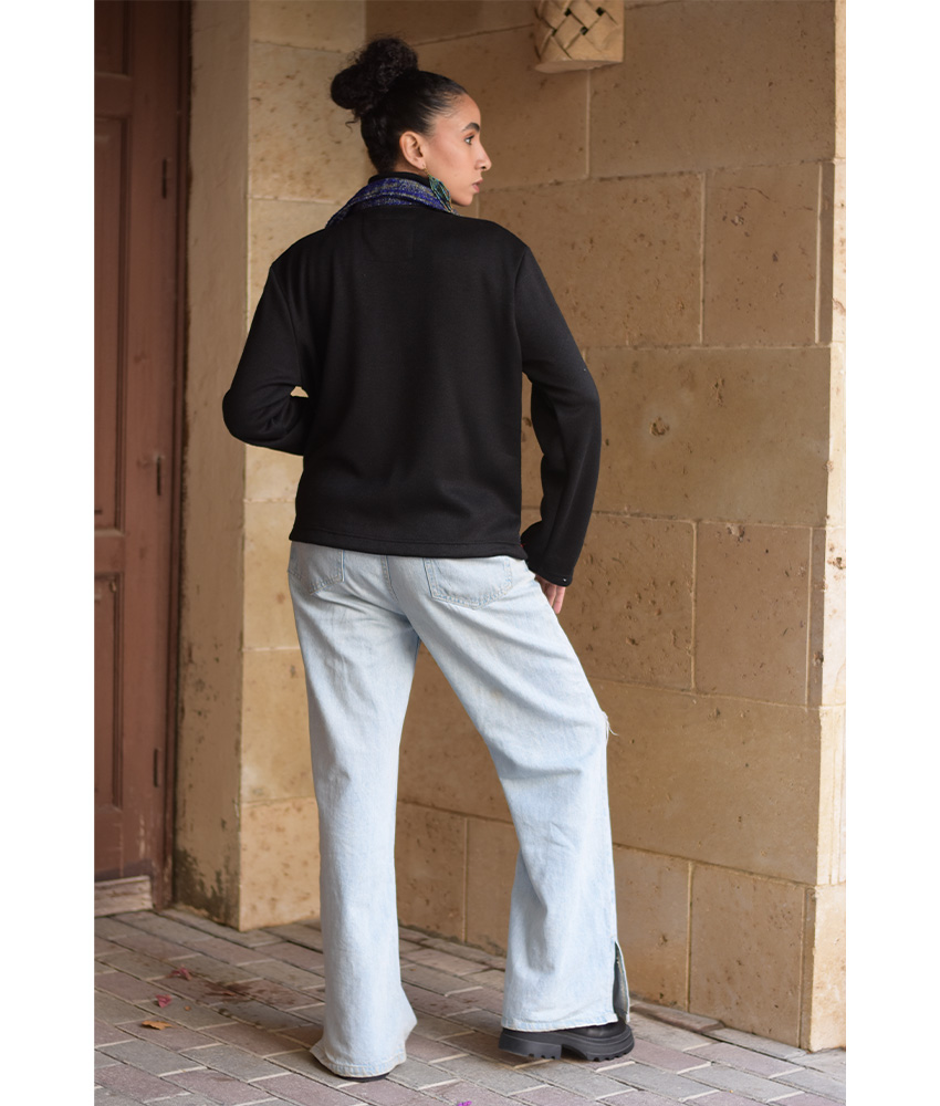 Black & Multicolored Cropped Akhmim Loomwoven Jacket – A modern cropped layer crafted from Akhmim loom-woven velour, cotton & wool with a soft, flexible back panel for ease and all-day comfort. Light yet warming, it’s your go-to for work, weekends, and travel.