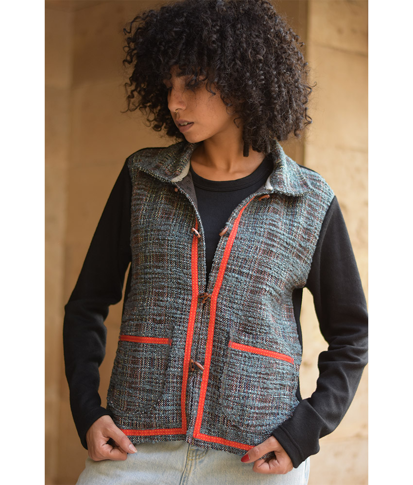 Black & Multicolored Cropped Akhmim Loomwoven Jacket – A modern cropped layer crafted from Akhmim loom-woven velour, cotton & wool with a soft, flexible back panel for ease and all-day comfort. Light yet warming, it’s your go-to for work, weekends, and travel.
