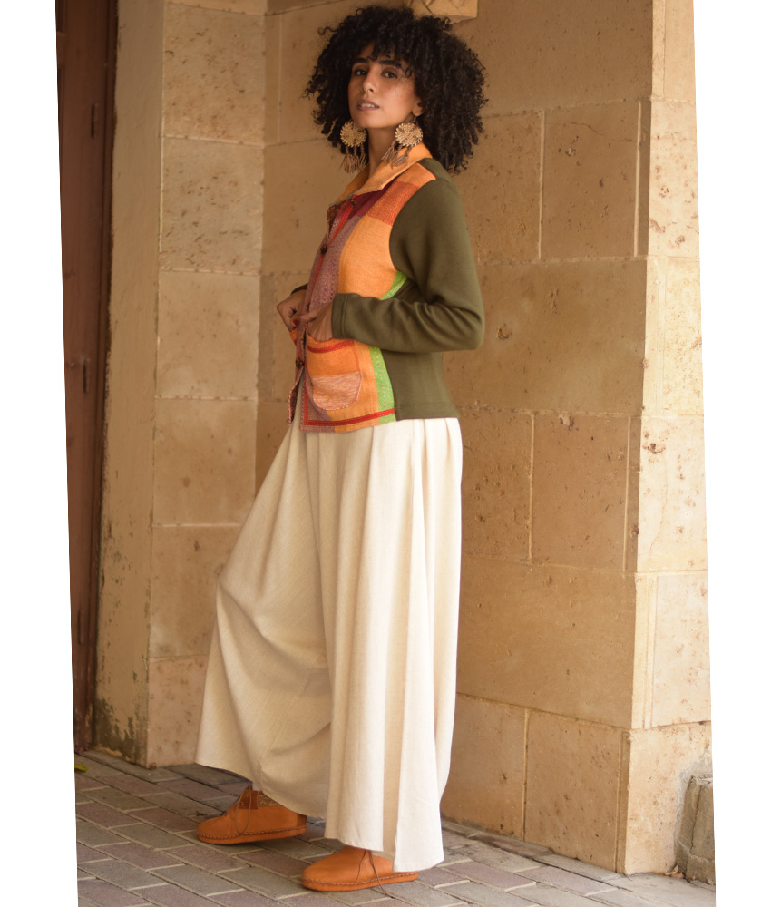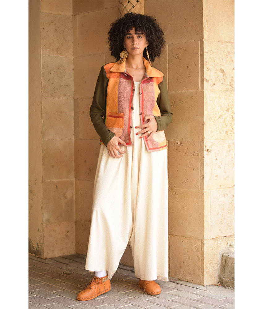 Dark Olive & Orange Cropped Akhmim Loomwoven Jacket – A modern cropped layer crafted from Akhmim loom-woven velour, cotton & wool with a soft, flexible back panel for ease and all-day comfort. Light yet warming, it’s your go-to for work, weekends, and travel.