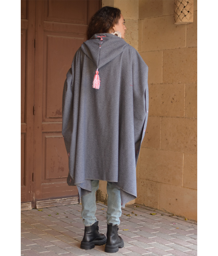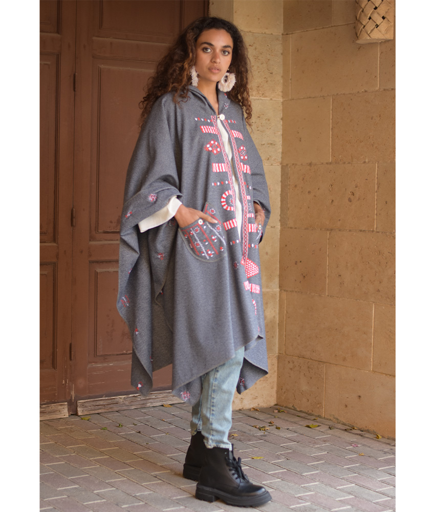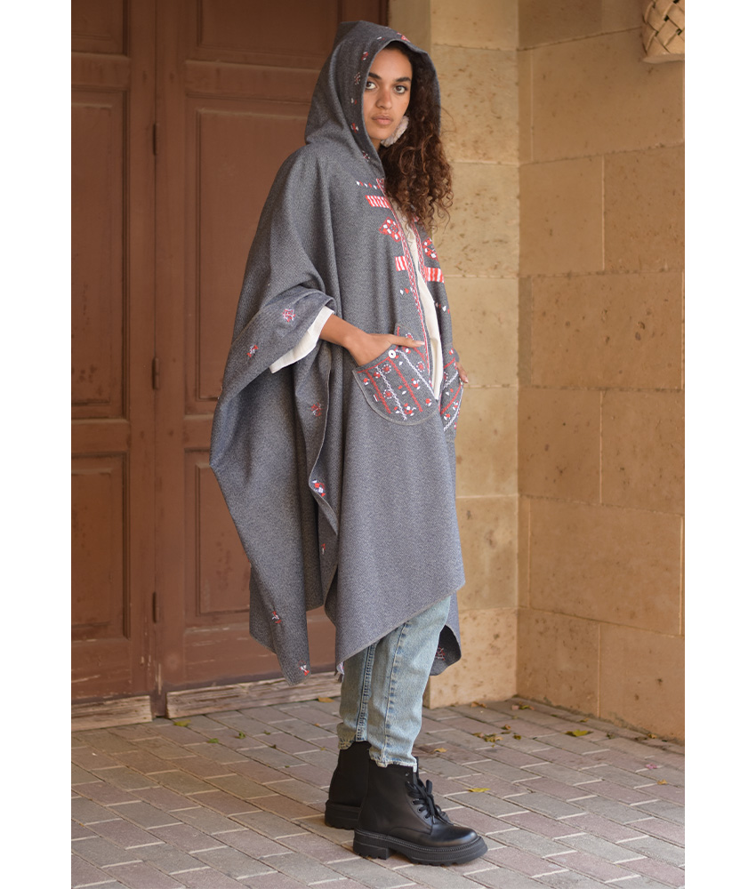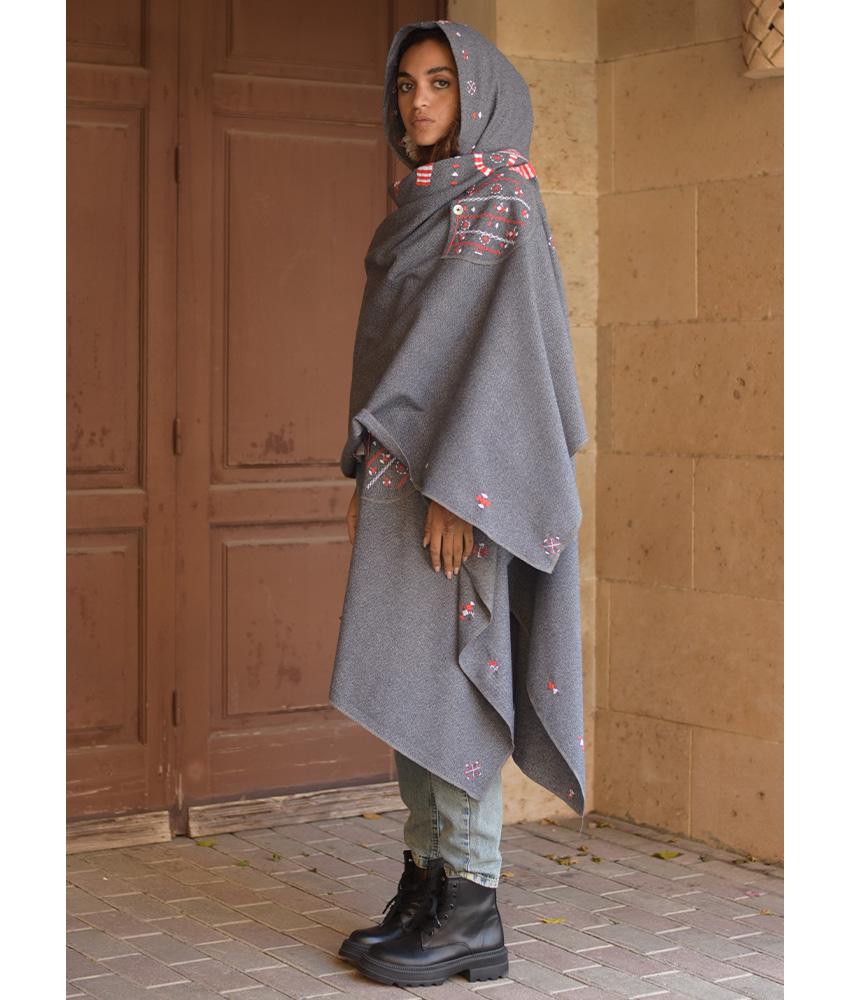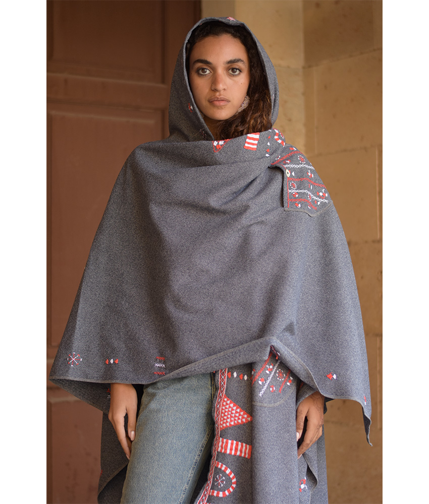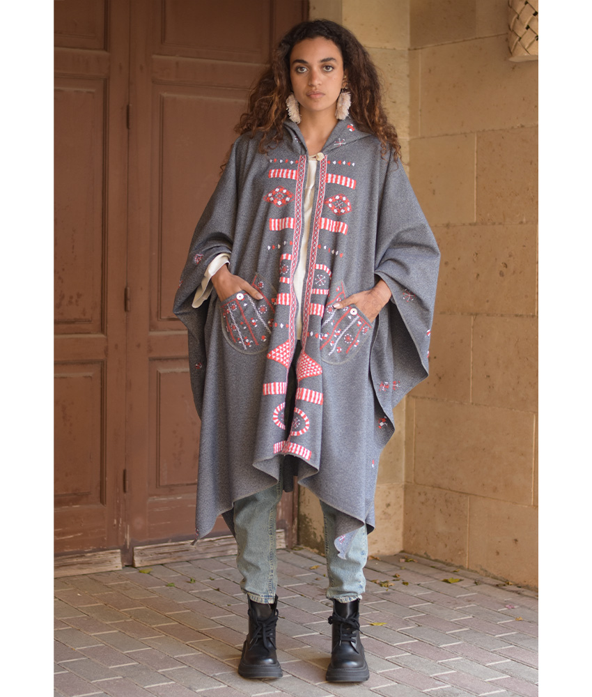 Grey Siwa Embroidered Wool Midi Cape – This beautiful midi cape is made of mixed wool. It is a statement piece that elegantly completes your outfit. It is adorned with the intricate and captivating embroideries by the hands of the talented women of Siwa. Our cooperation gives them an opportunity to express themselves freely with the needle and helps preserving this beautiful traditional handicraft.