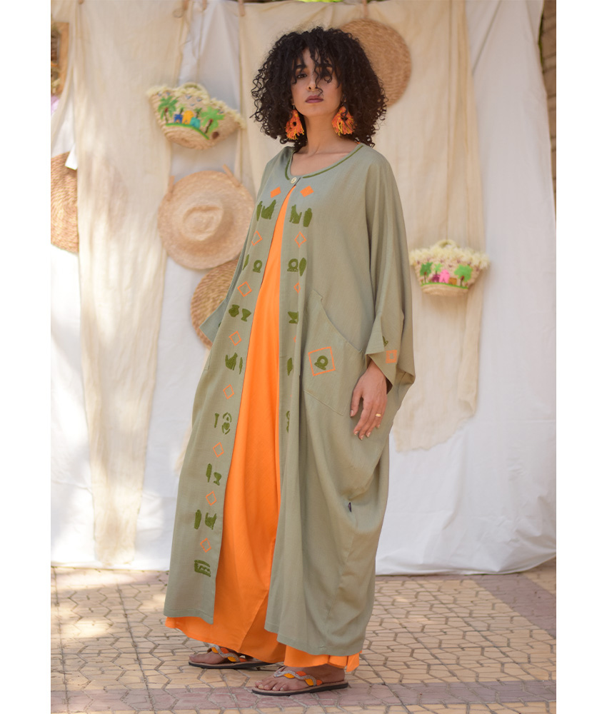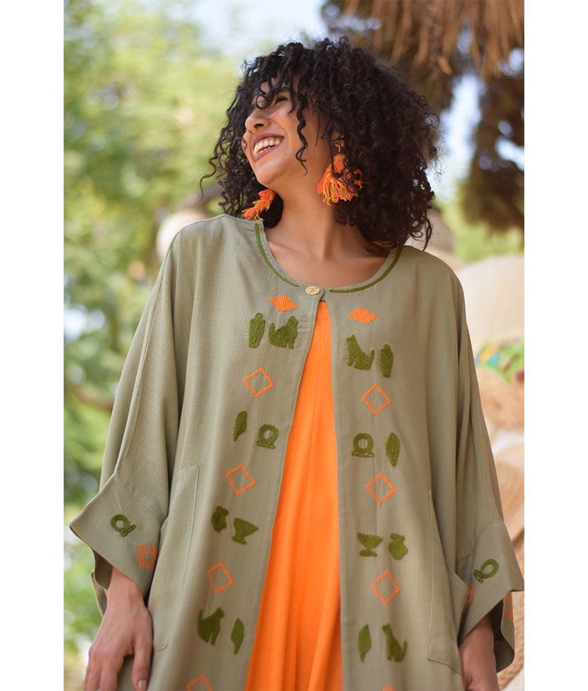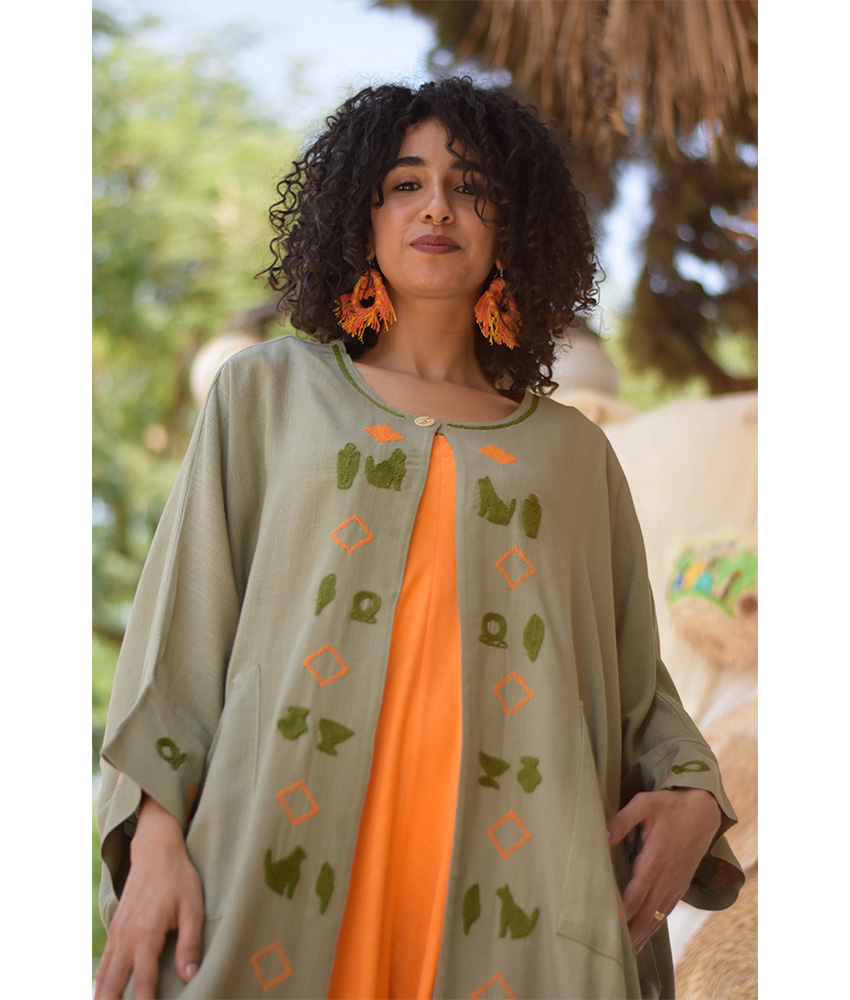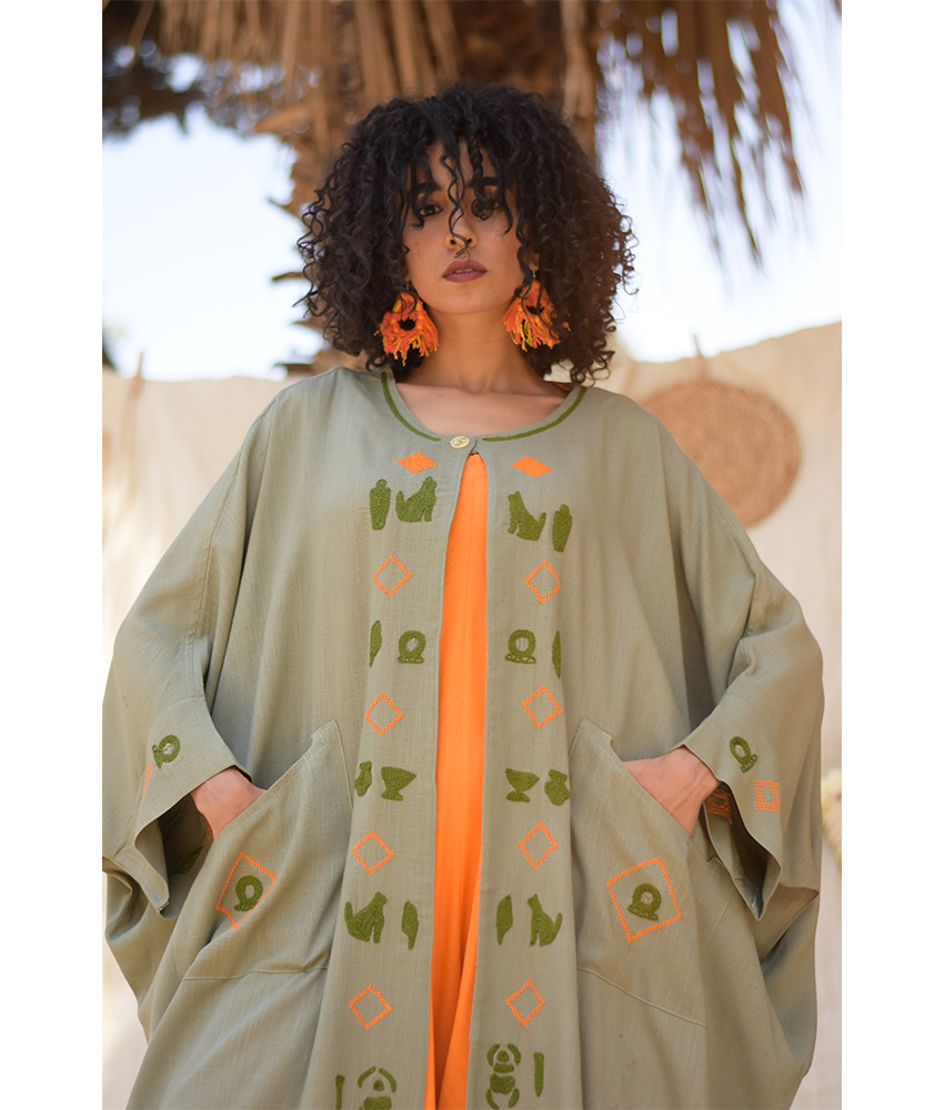 Olive Green Linen Cardigan with Mansag Embroideries – This gorgeous cardigan is made of linen. The intricate work on this cardigan has been done by the skilled hands of talented craftswomen in Sohag, Upper Egypt.