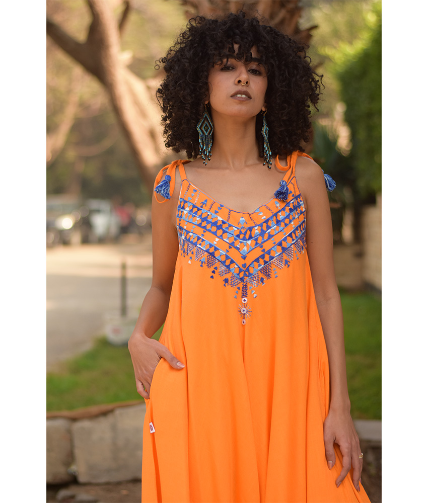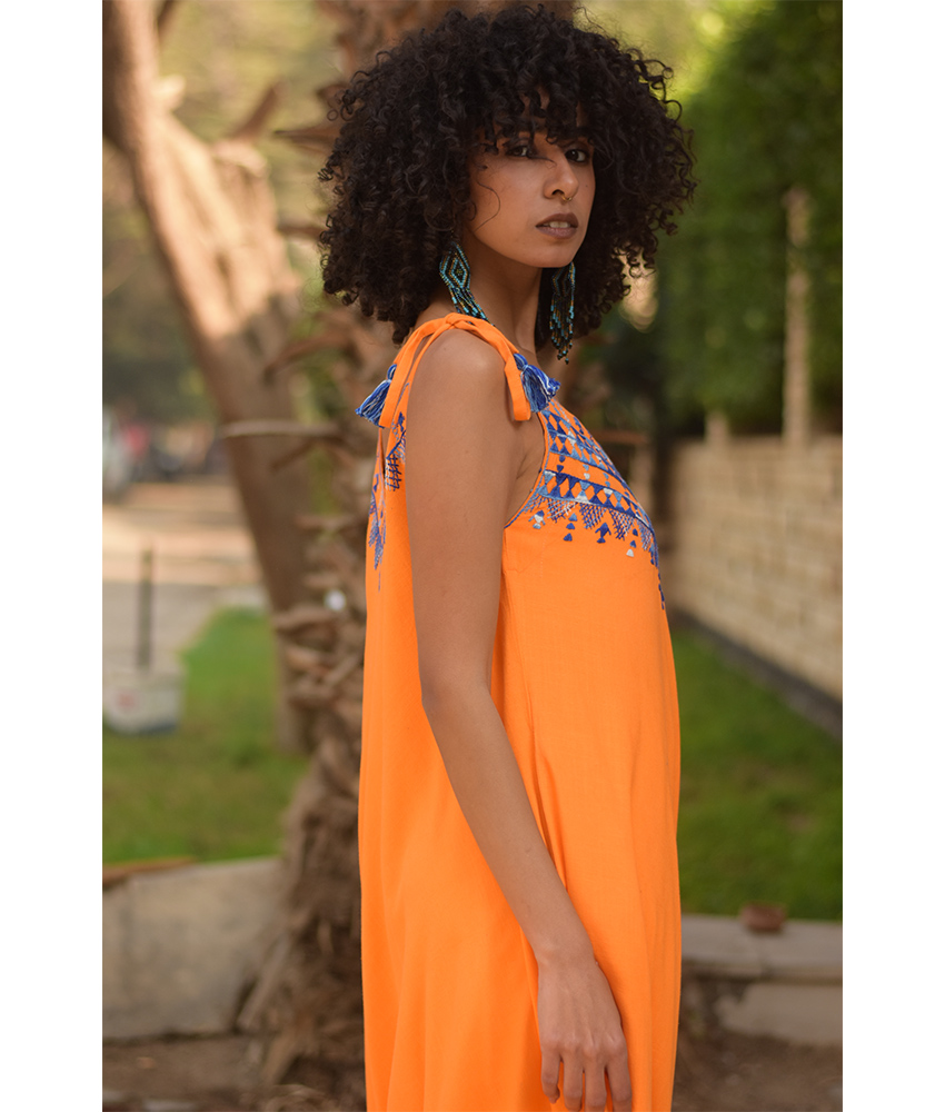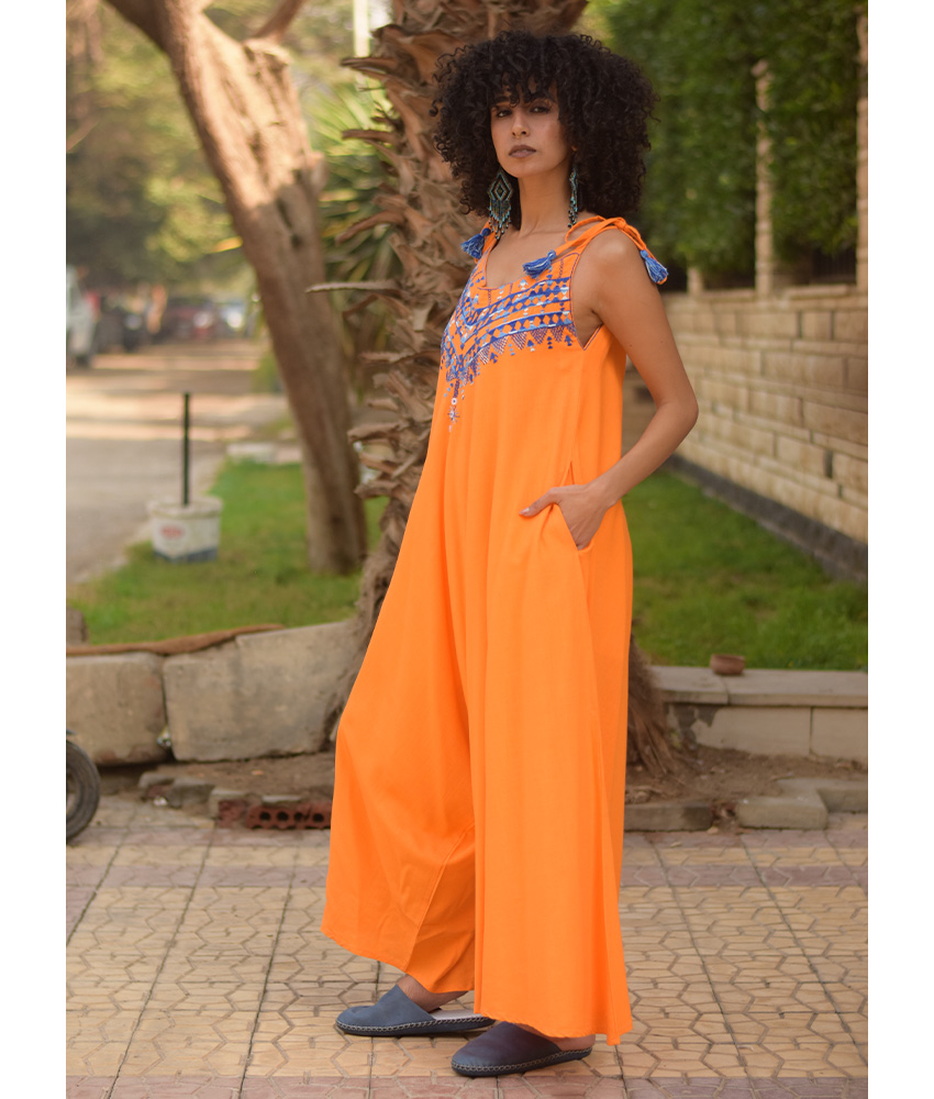Orange Siwa Embroidered Linen Flowy Jumpsuit/Dress