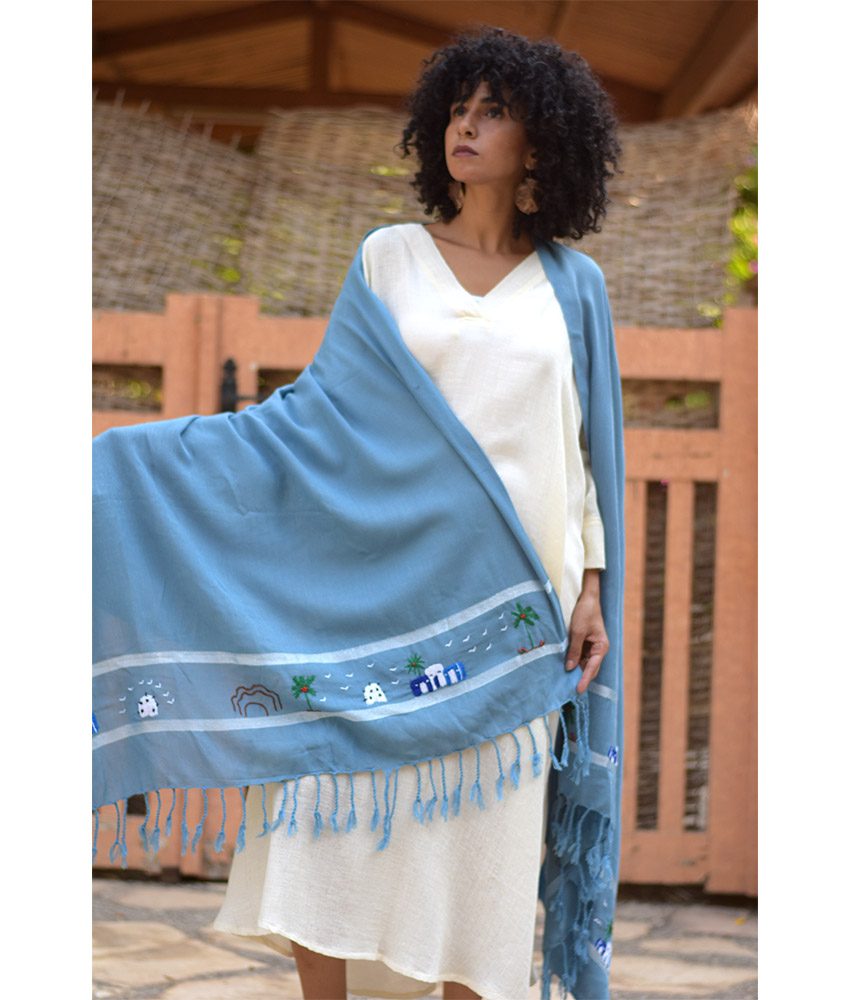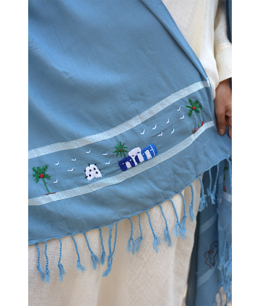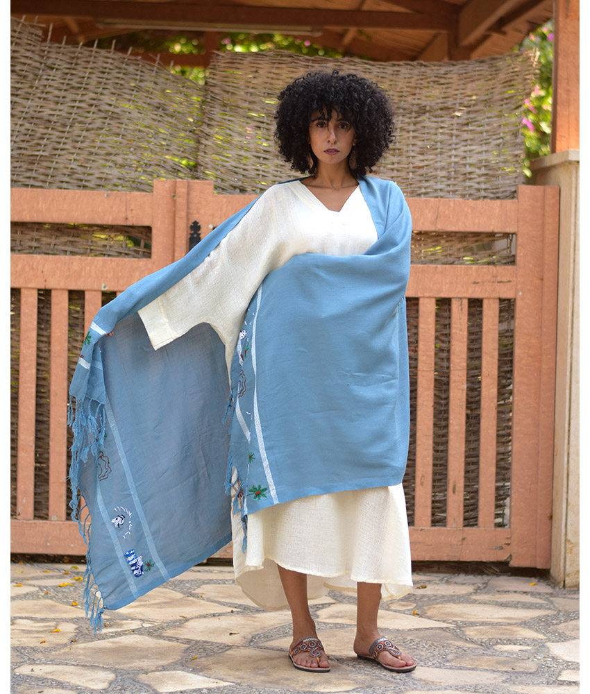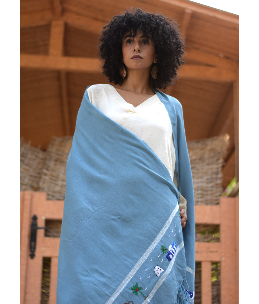 Baby Blue Handwoven Viscose Shawl with Hand Embroideries