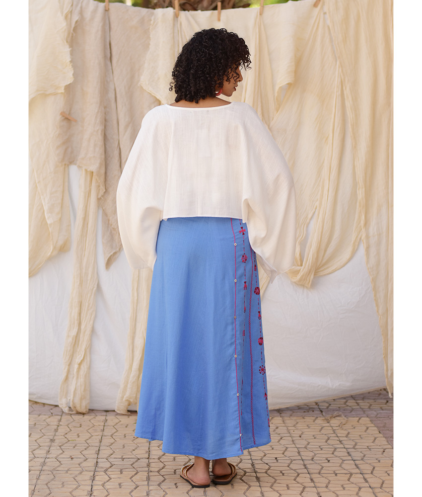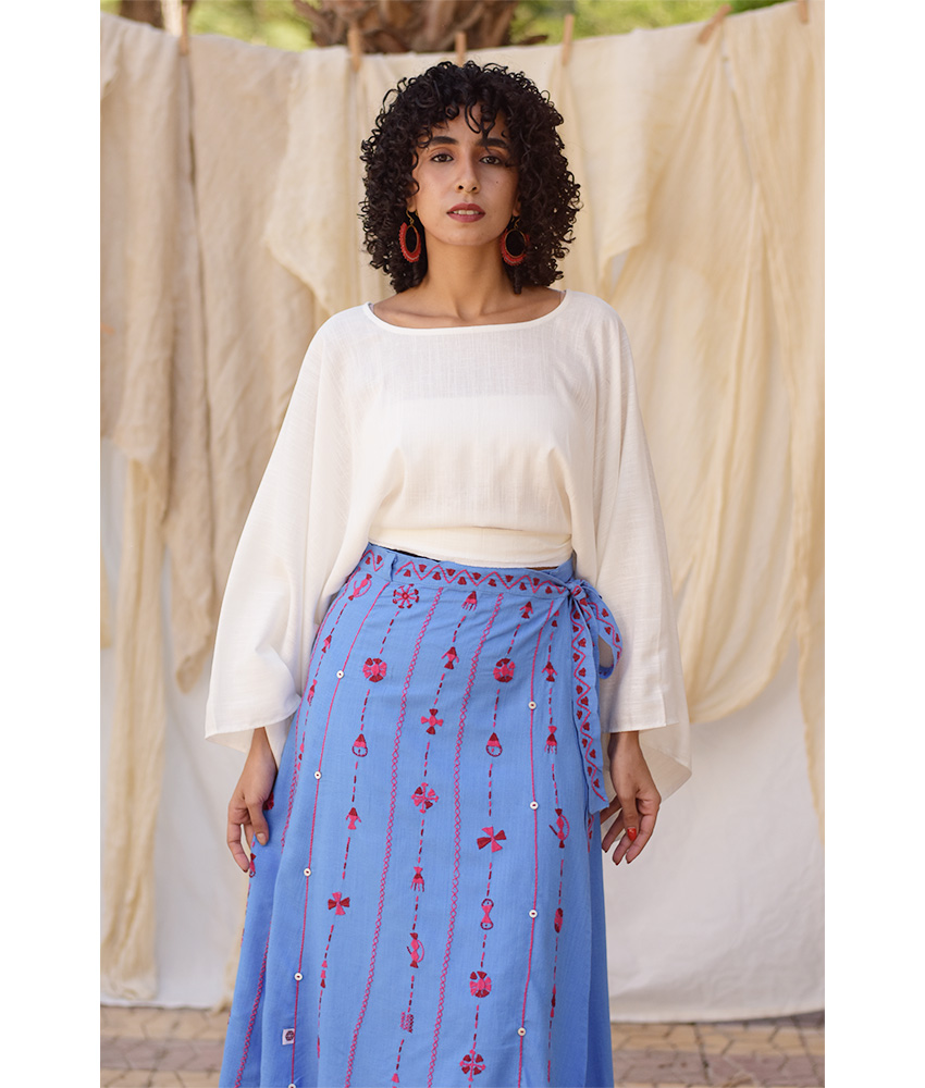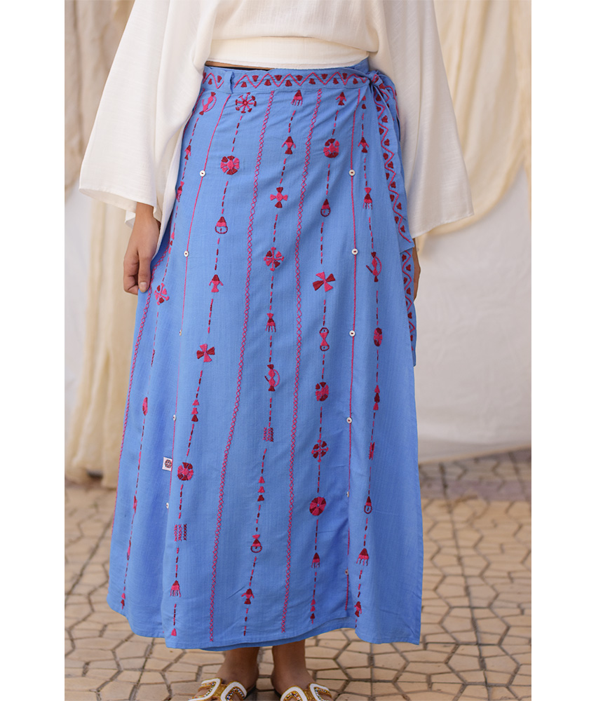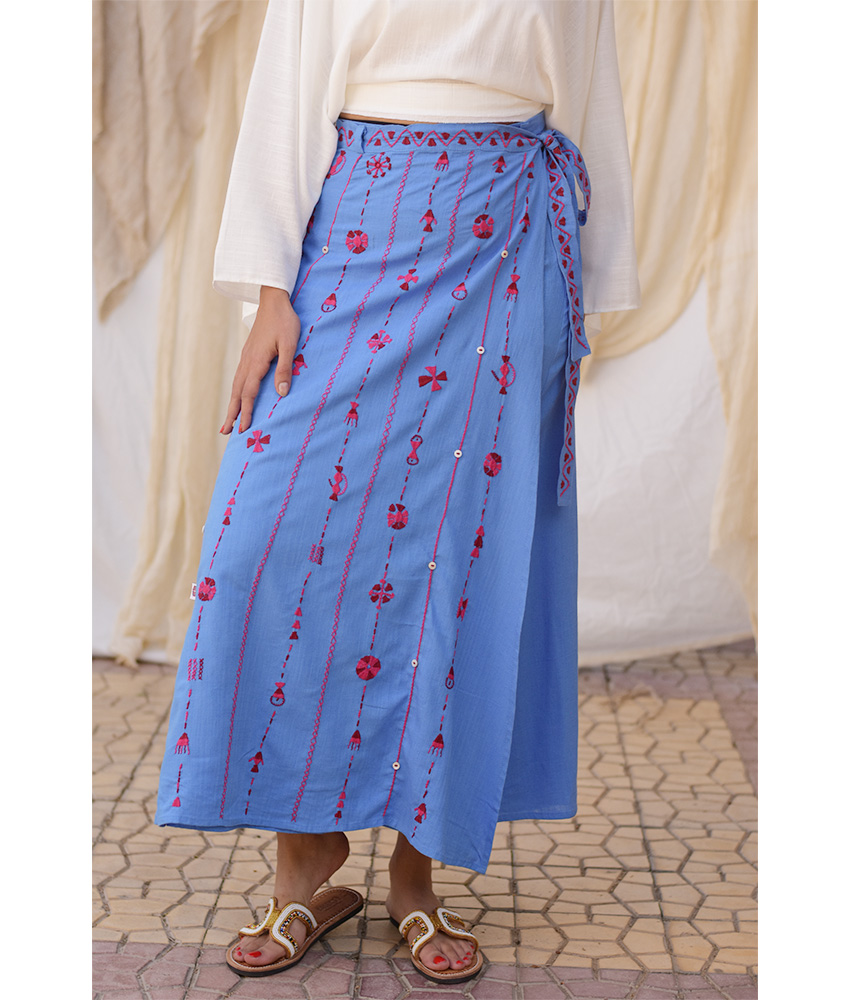 Denim Blue Siwa Embroidered Linen Wrap Skirt