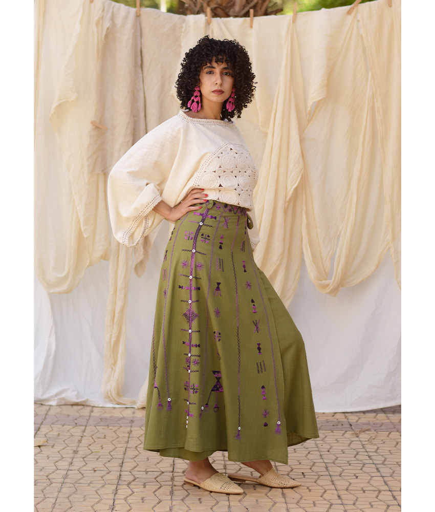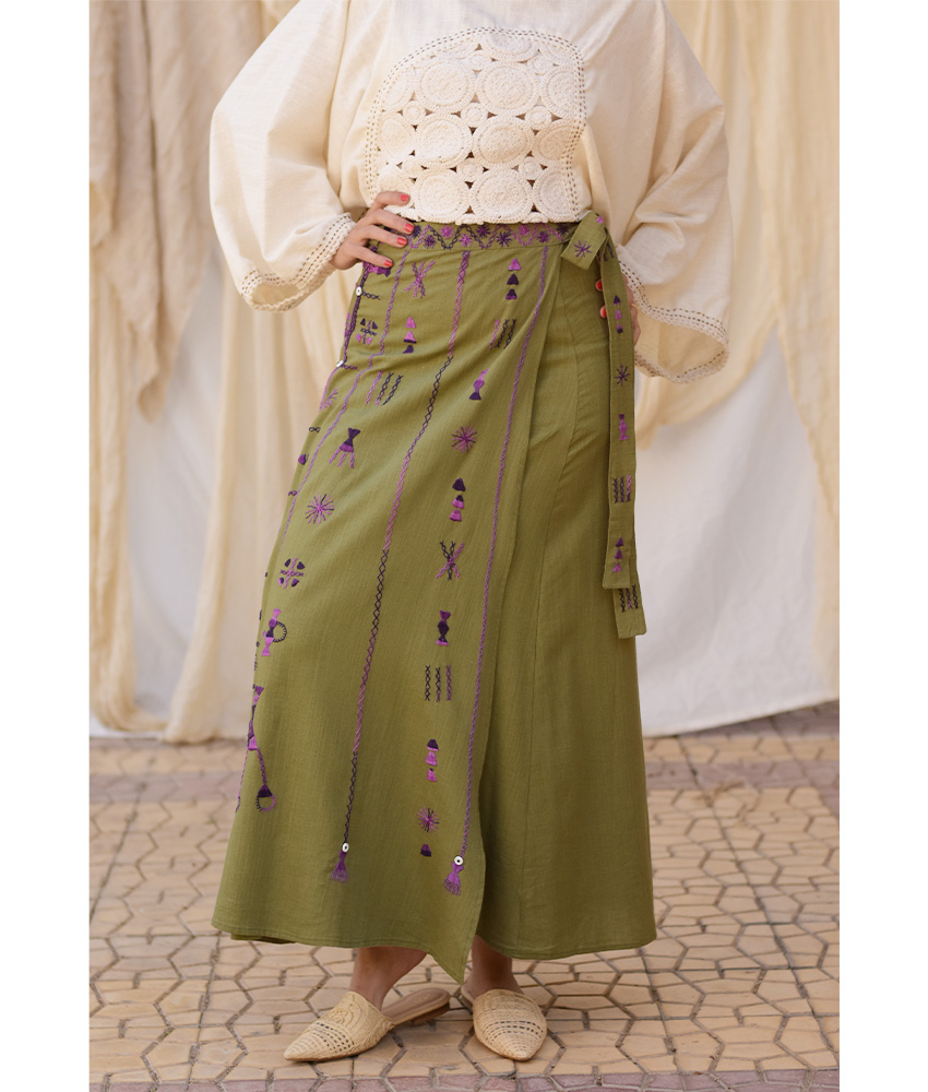 Olive Green Siwa Embroidered Linen Wrap Skirt