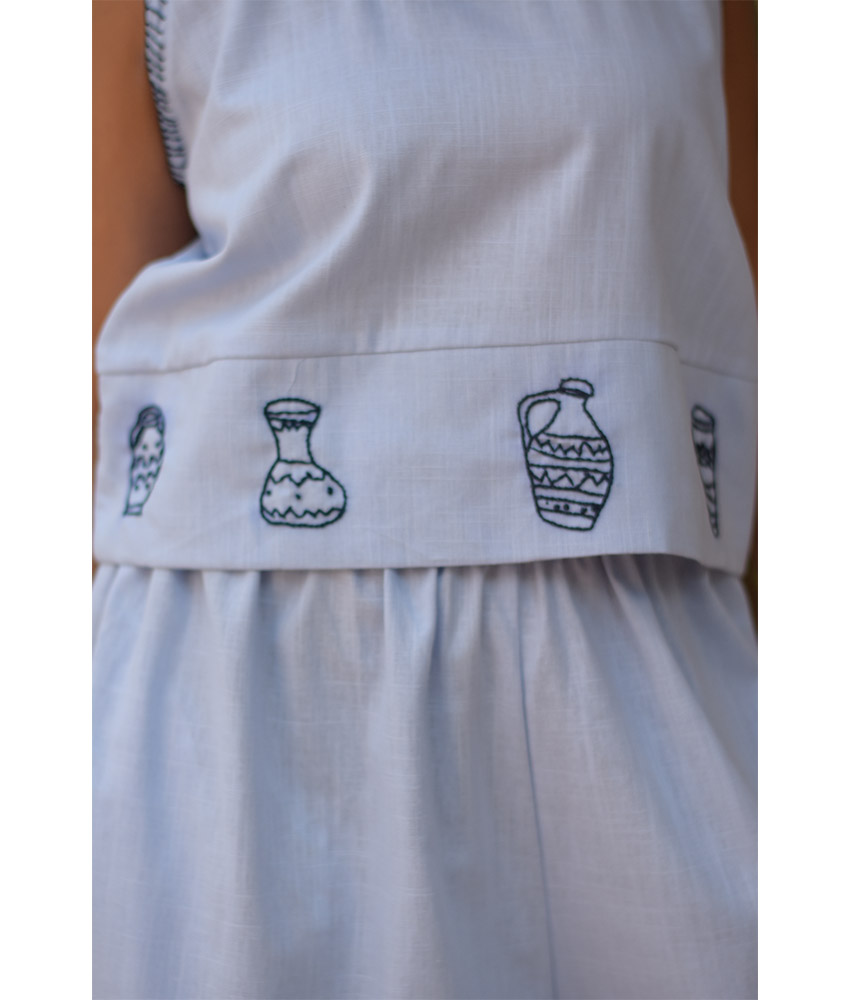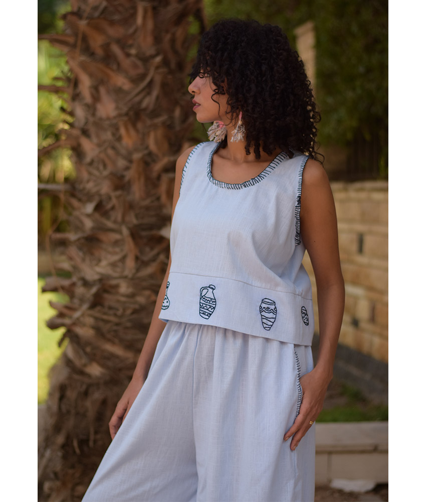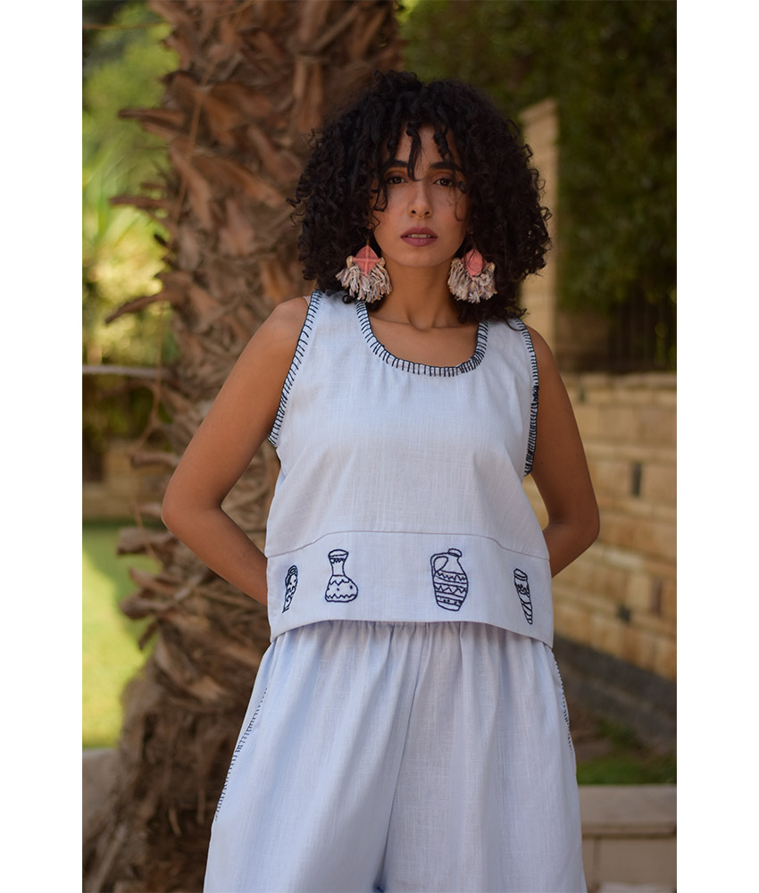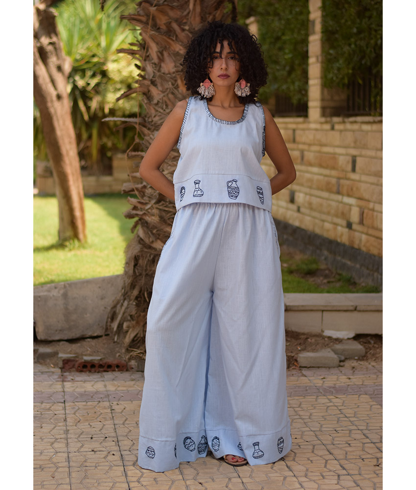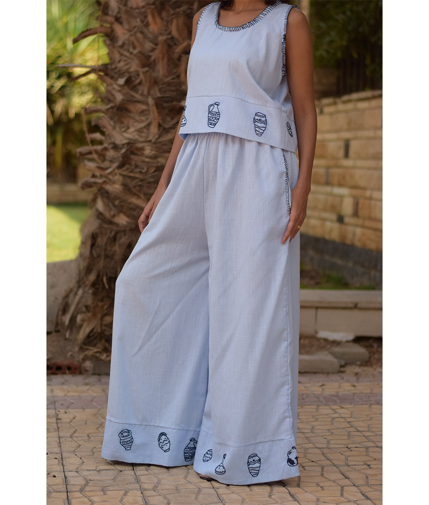 Baby Blue Cotton Set with Hand Embroideries – This gorgeous set is made of Cotton. It is adorned with the intricate and captivating embroideries by the hands of the talented women of Fayoum. Our cooperation gives them an opportunity to express themselves freely with the needle and helps preserving this beautiful traditional handicraft.