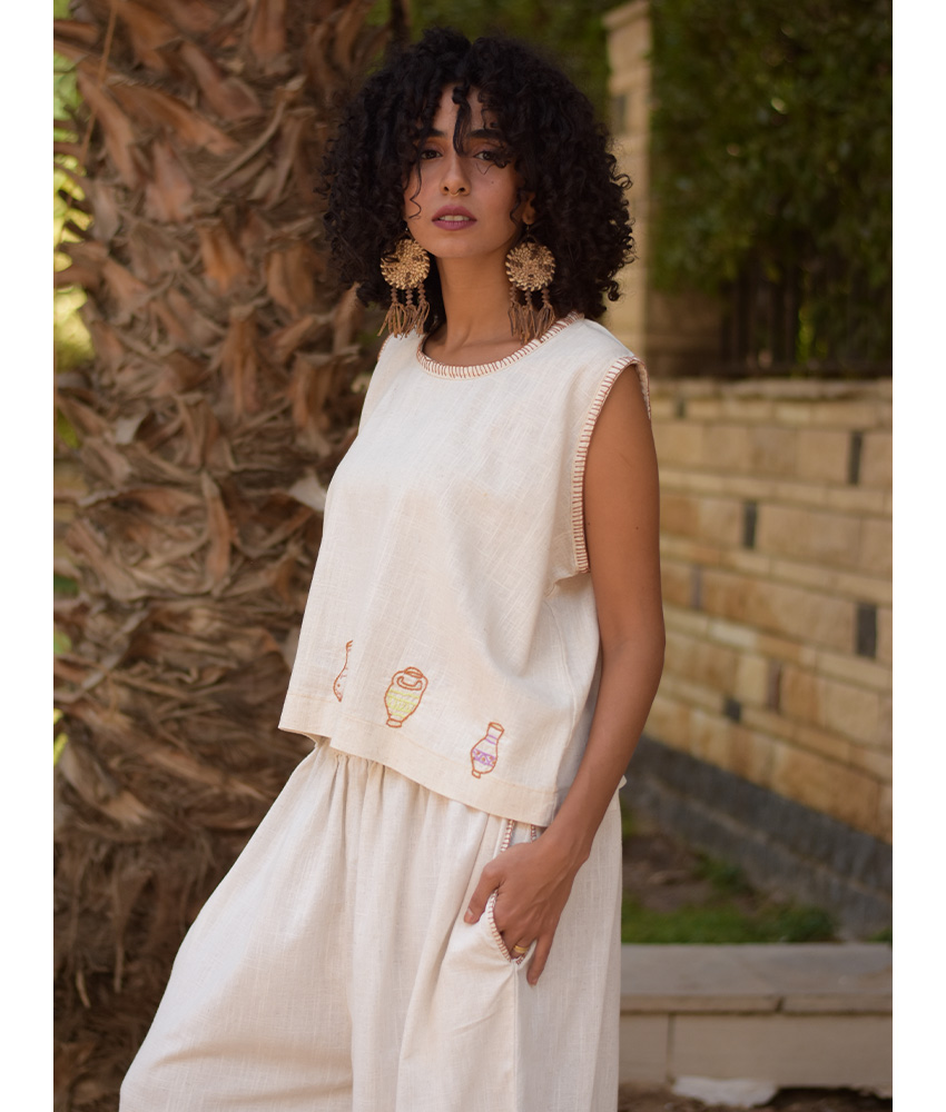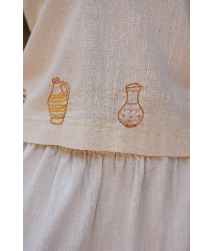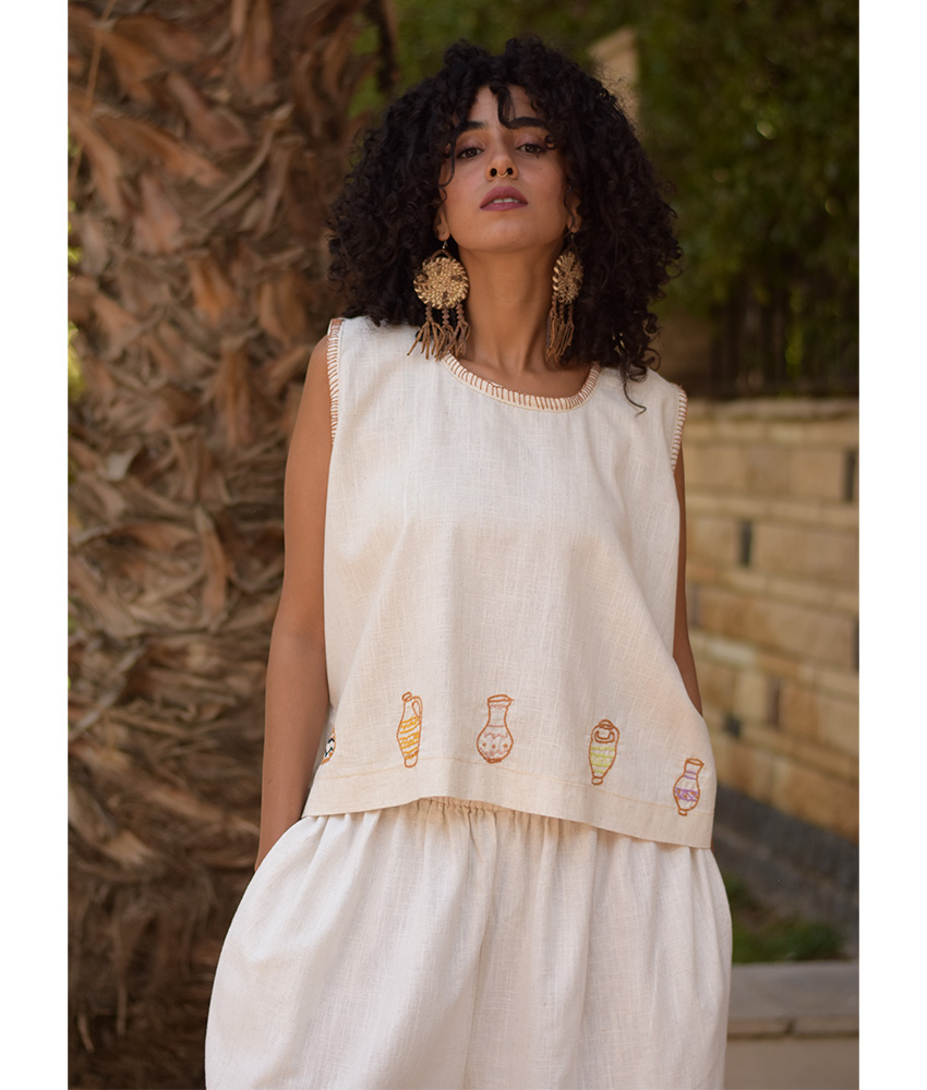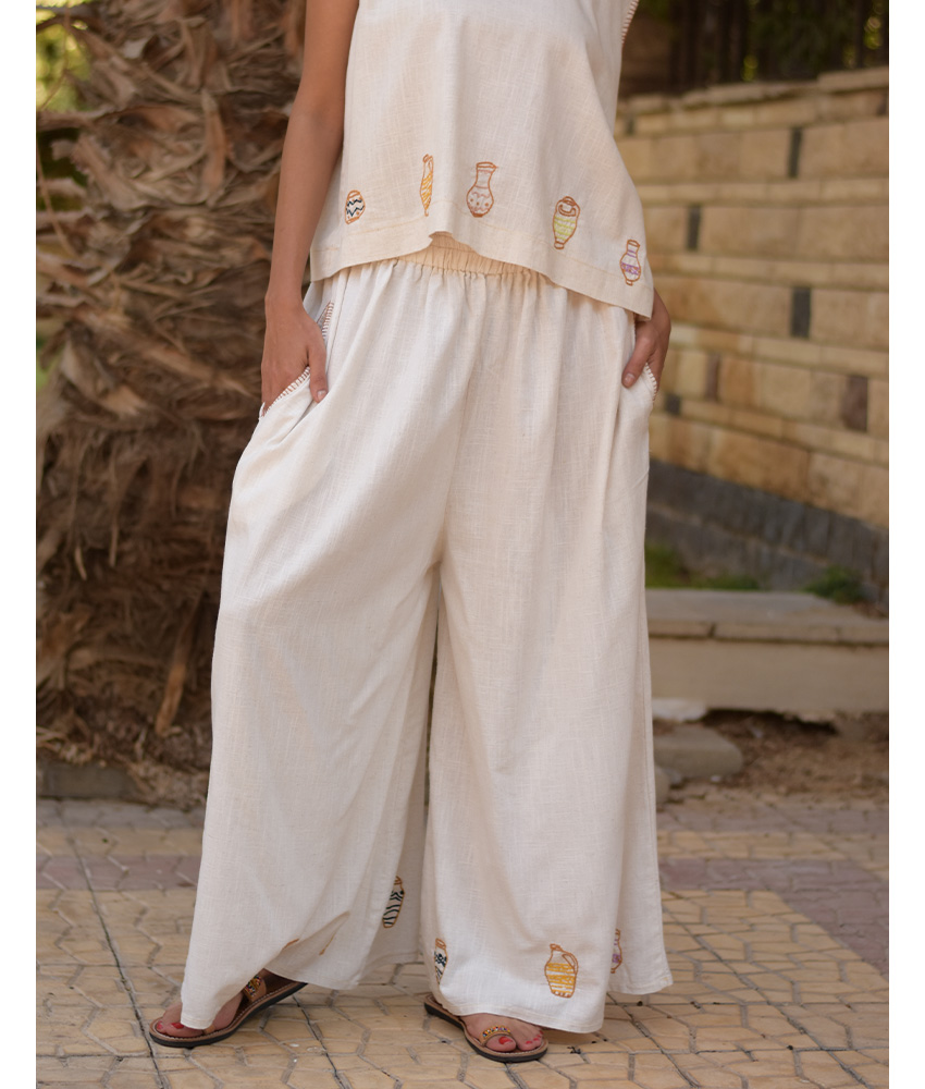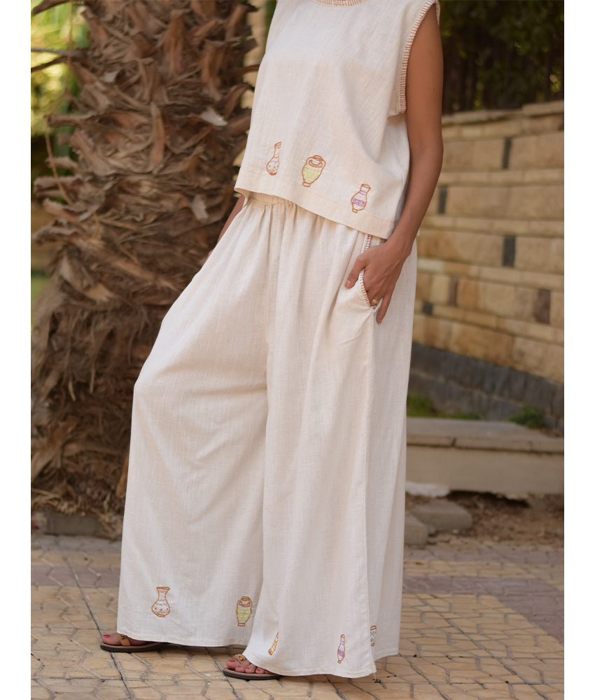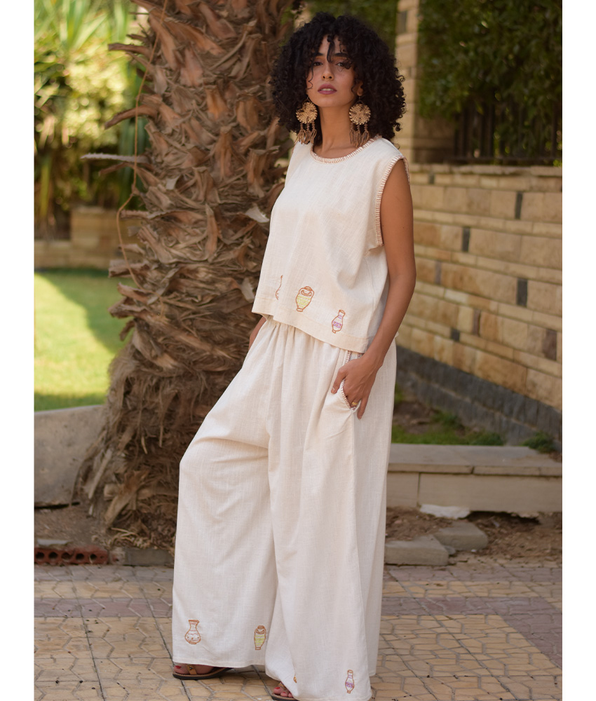 Off White Linen Set with Hand Embroideries – This gorgeous set is made of Linen. It is adorned with the intricate and captivating embroideries by the hands of the talented women of Fayoum. Our cooperation gives them an opportunity to express themselves freely with the needle and helps preserving this beautiful traditional handicraft.