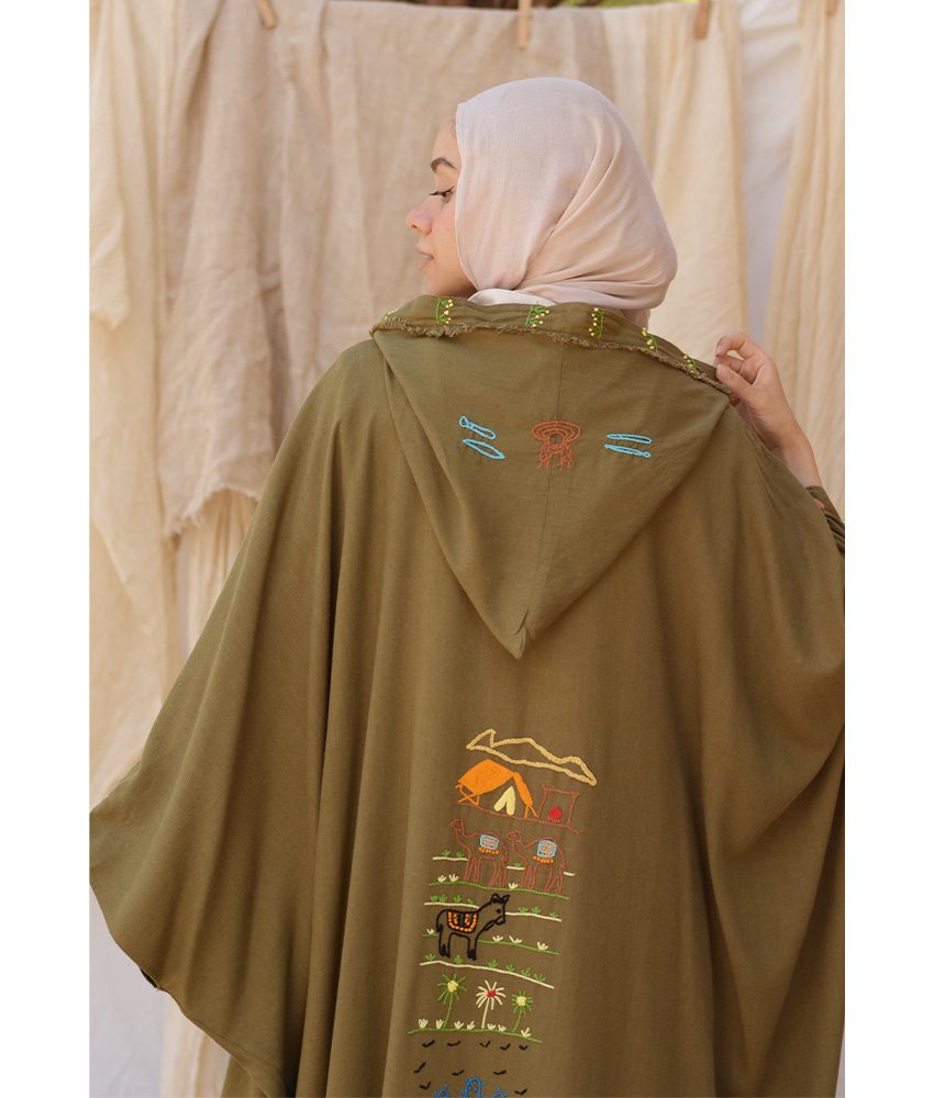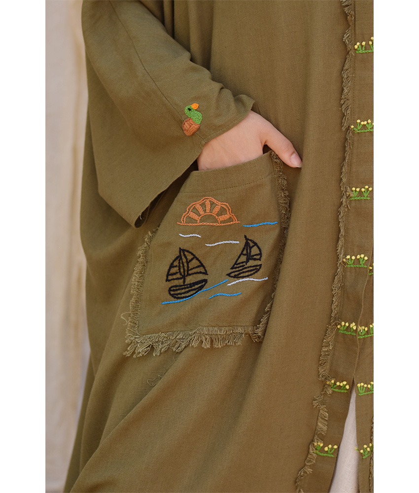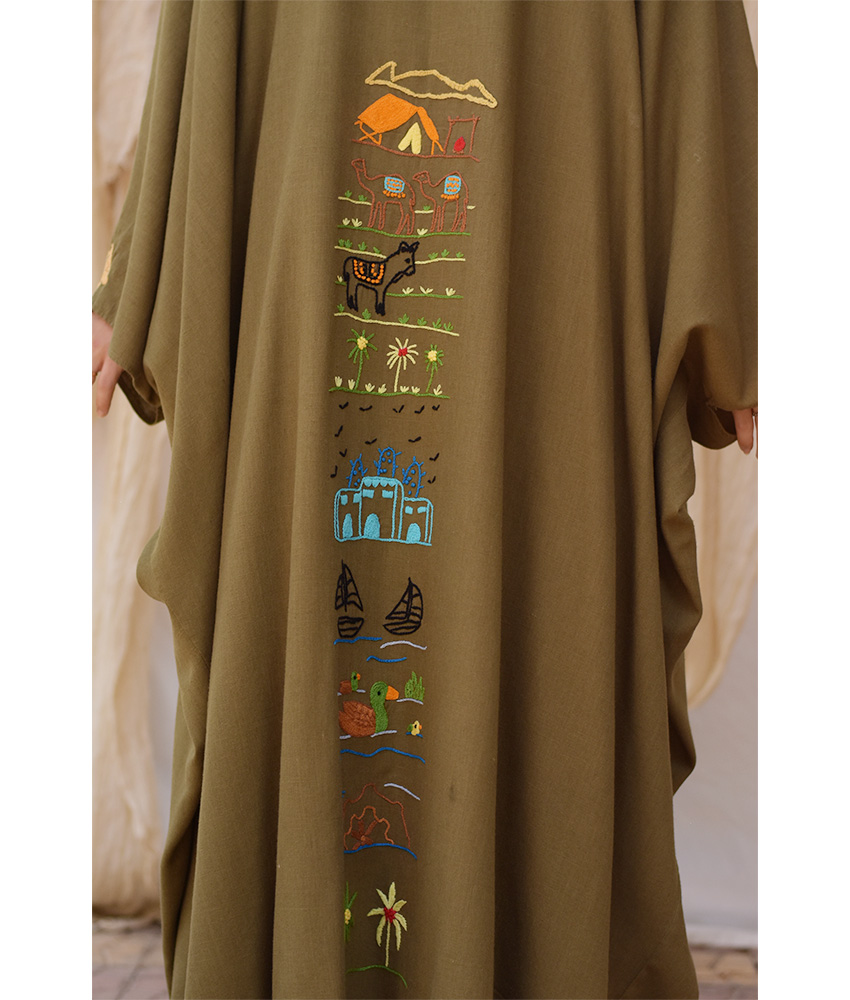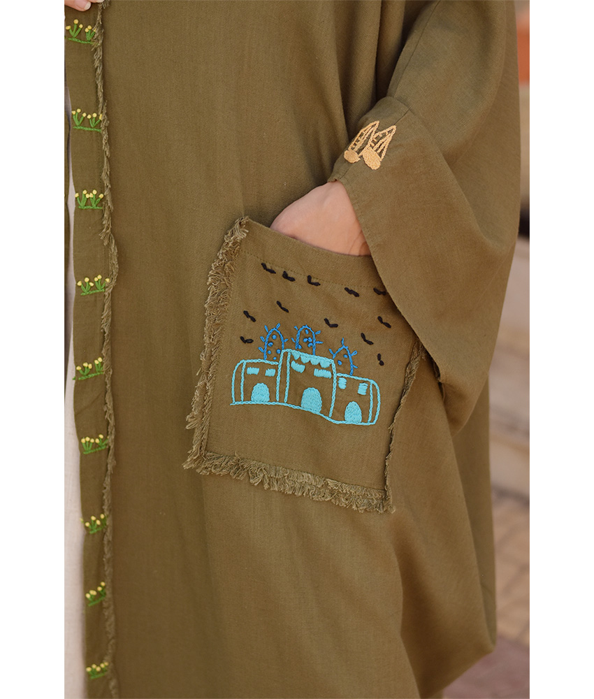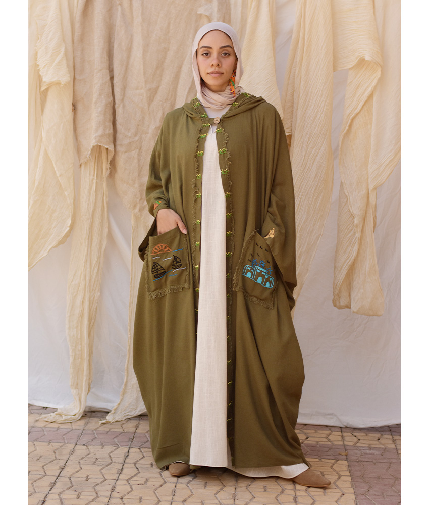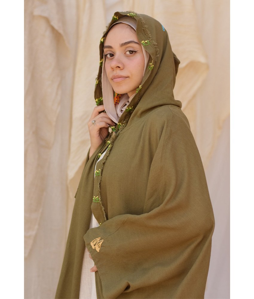 Army Green Hand Embroidered Linen Cardigan/Abaya with Hoodie – This gorgeous soft cardigan/abaya is made of linen. It is adorned with the intricate and captivating embroideries by the hands of the talented women of Fayoum. Our cooperation gives them an opportunity to express themselves freely with the needle and helps preserving this beautiful traditional handicraft.