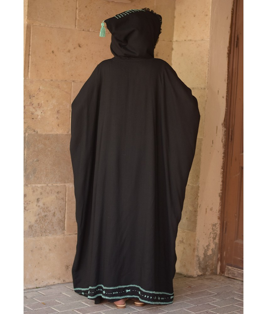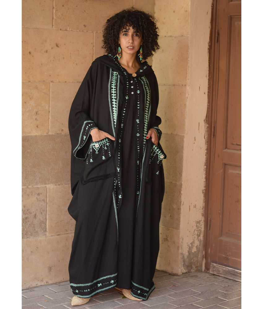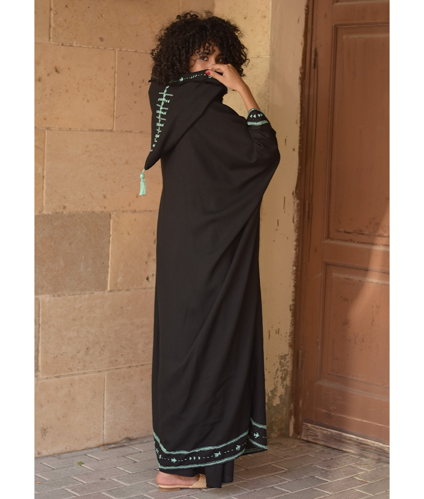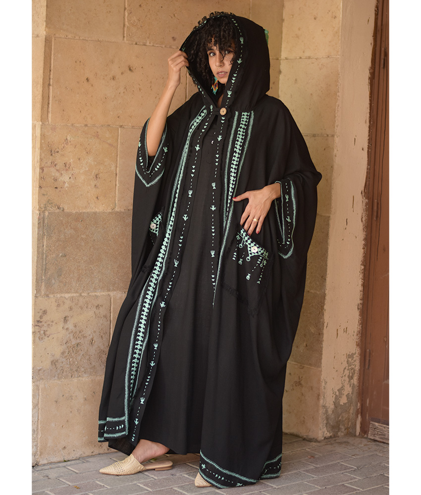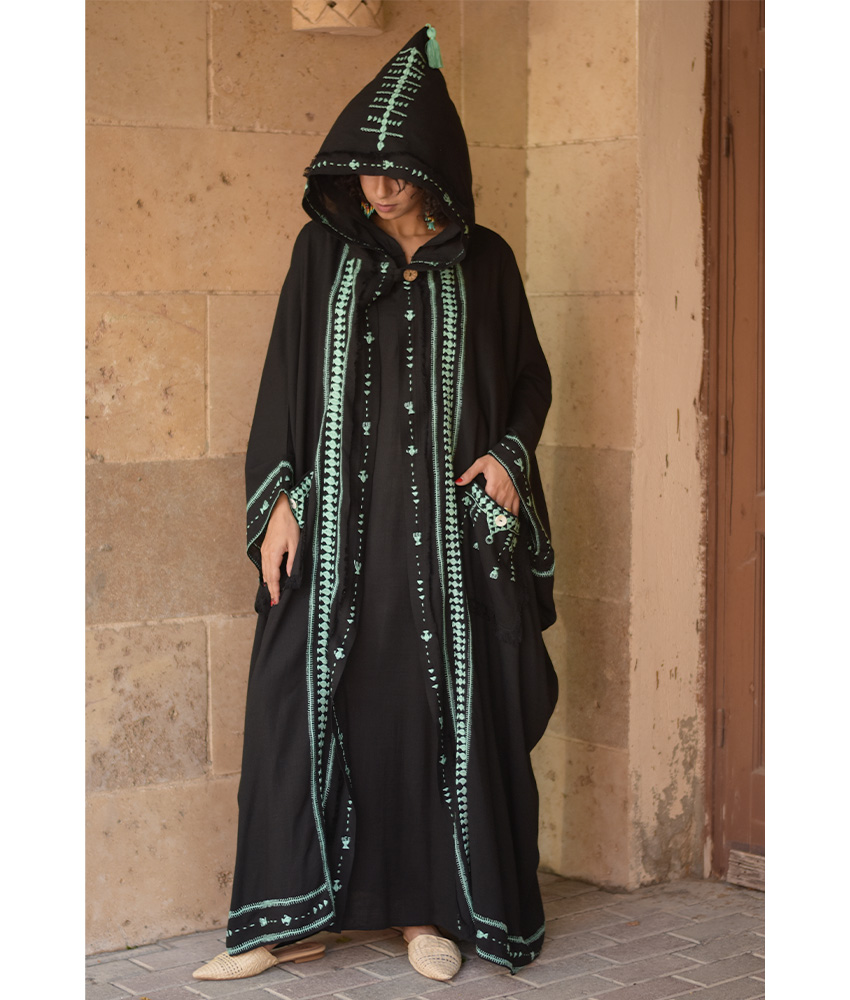 Black Siwa Embroidered Linen Cardigan/Abaya with Hoodie – This gorgeous soft cardigan/abaya is made of linen. It is adorned with the intricate and captivating embroideries by the hands of the talented women of Siwa. Our cooperation gives them an opportunity to express themselves freely with the needle and helps preserving this beautiful traditional handicraft.