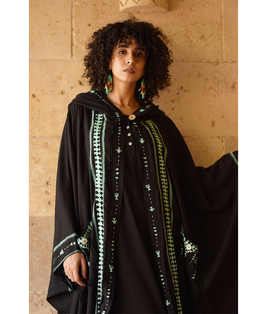 Black Siwa Embroidered Linen Cardigan/Abaya with Hoodie