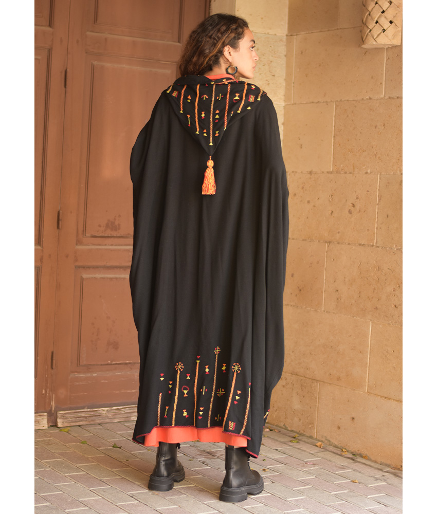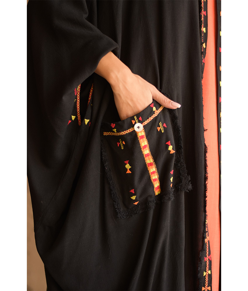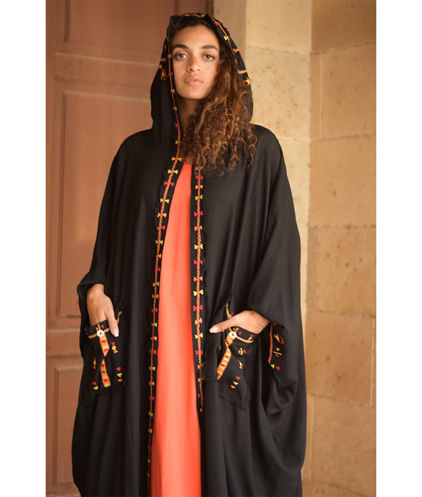Black Siwa Embroidered Linen Cardigan/Abaya with Hoodie