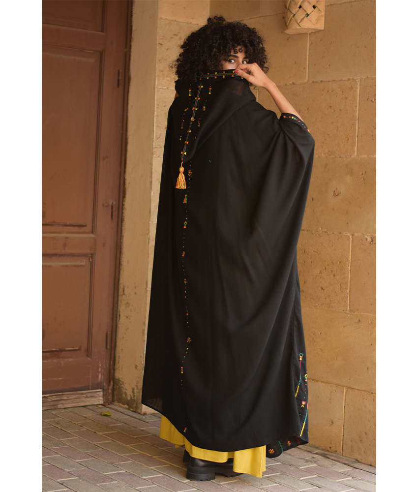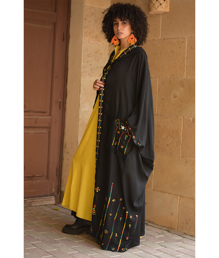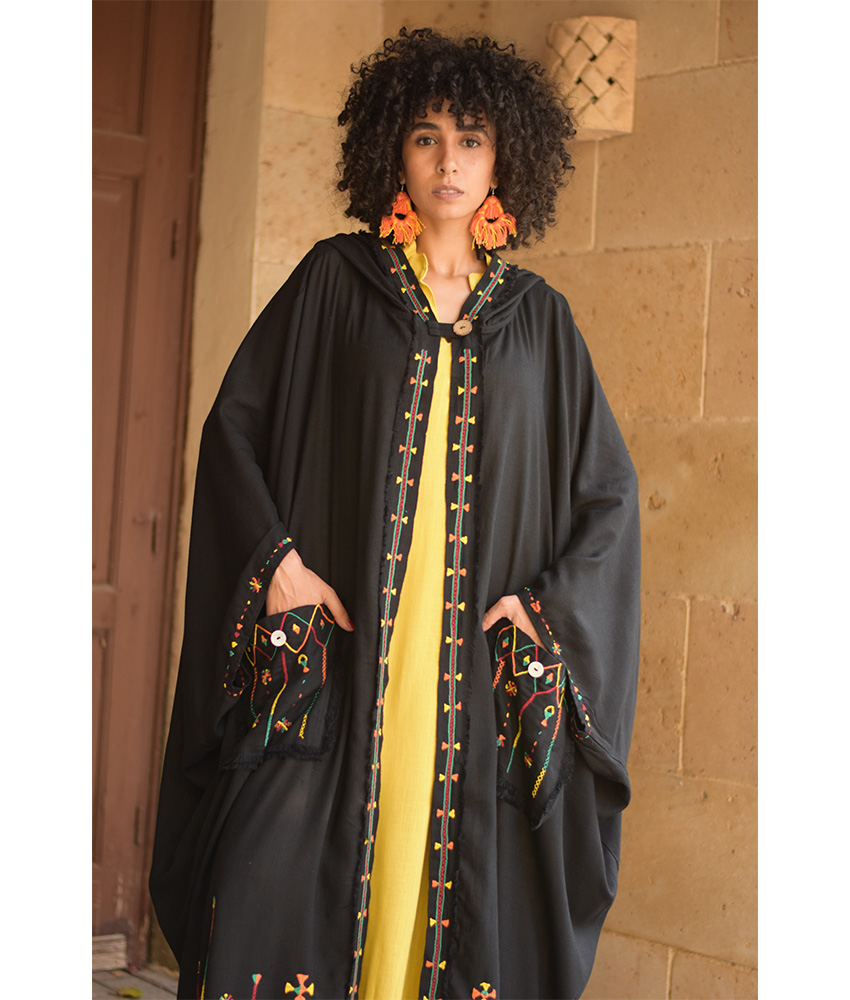 Black Siwa Embroidered Linen Cardigan/Abaya with Hoodie