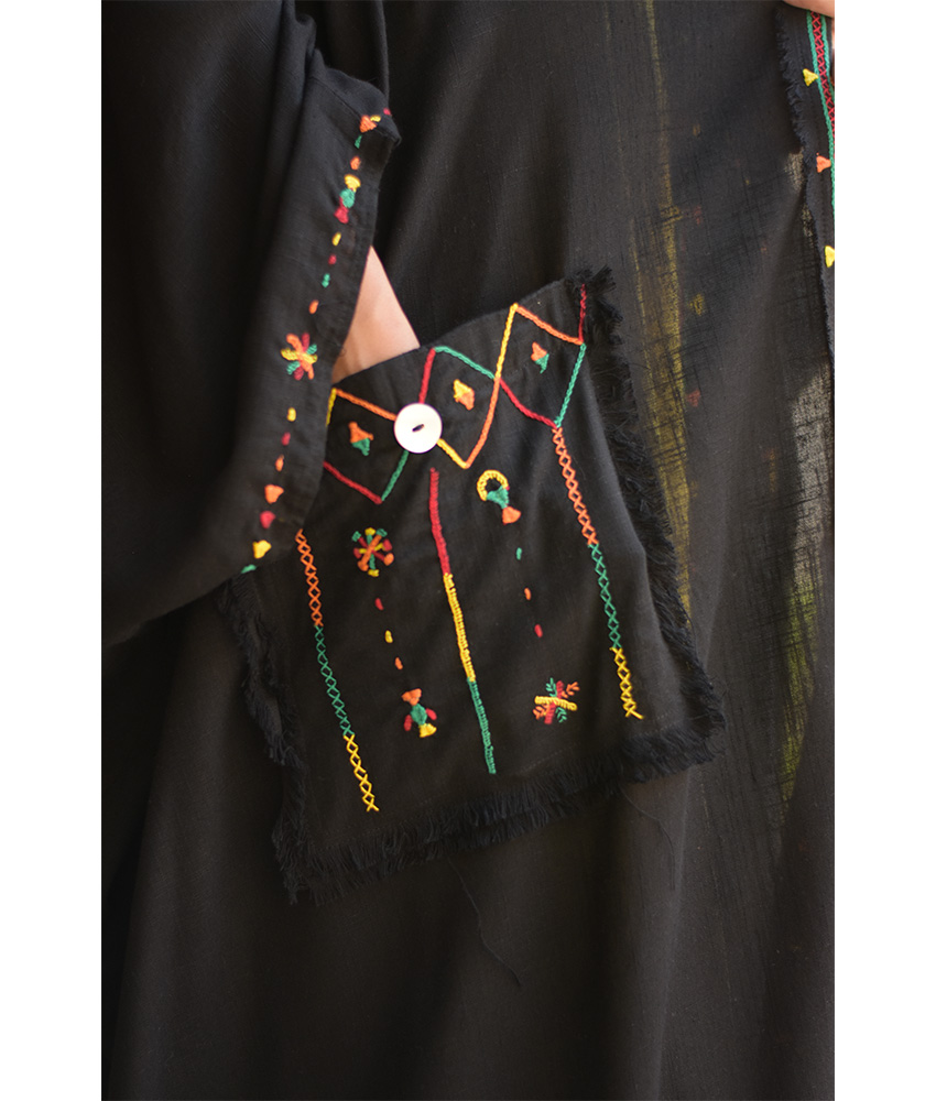 This gorgeous soft cardigan/abaya is made of linen. It is adorned with the intricate and captivating embroideries by the hands of the talented women of Siwa. Our cooperation gives them an opportunity to express themselves freely with the needle and helps preserving this beautiful traditional handicraft.