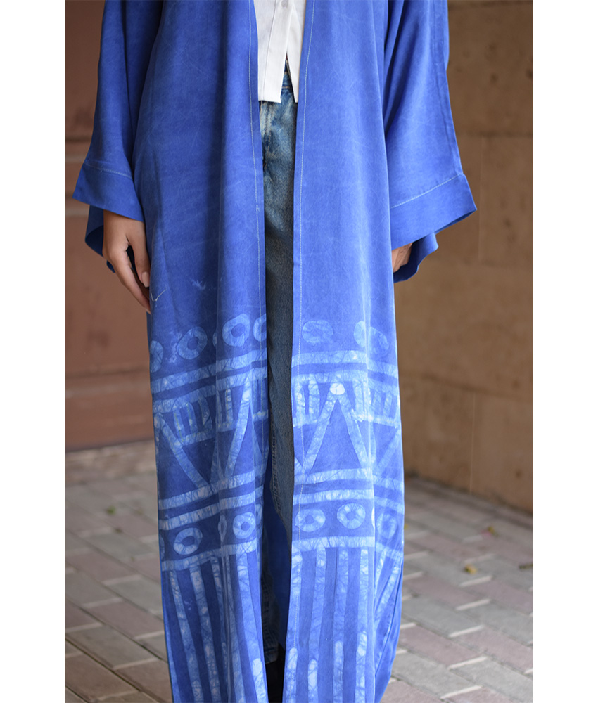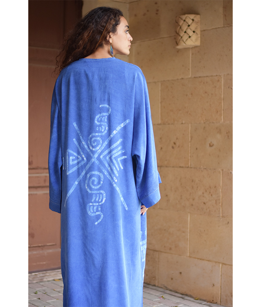 Denim Blue Batik Dyed Nubian Cardigan – Eman Farag – Introducing the “Nubian Batik” Collection: Handmade Dyed Fabrics Infused with the Artistry of Batik!
