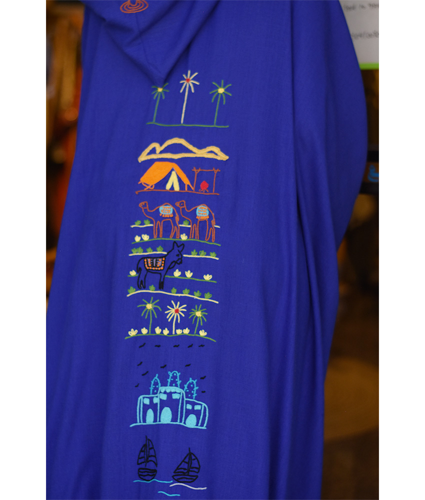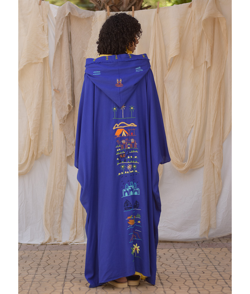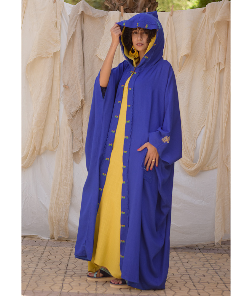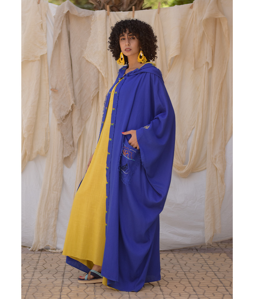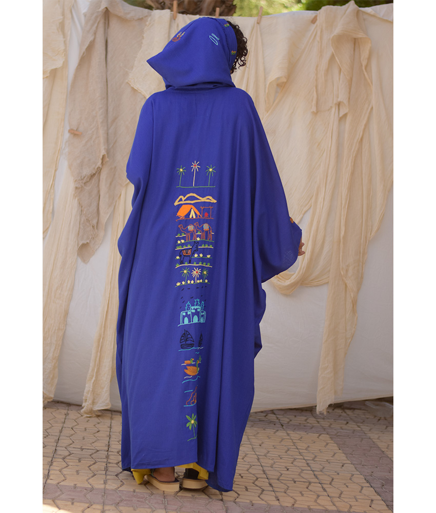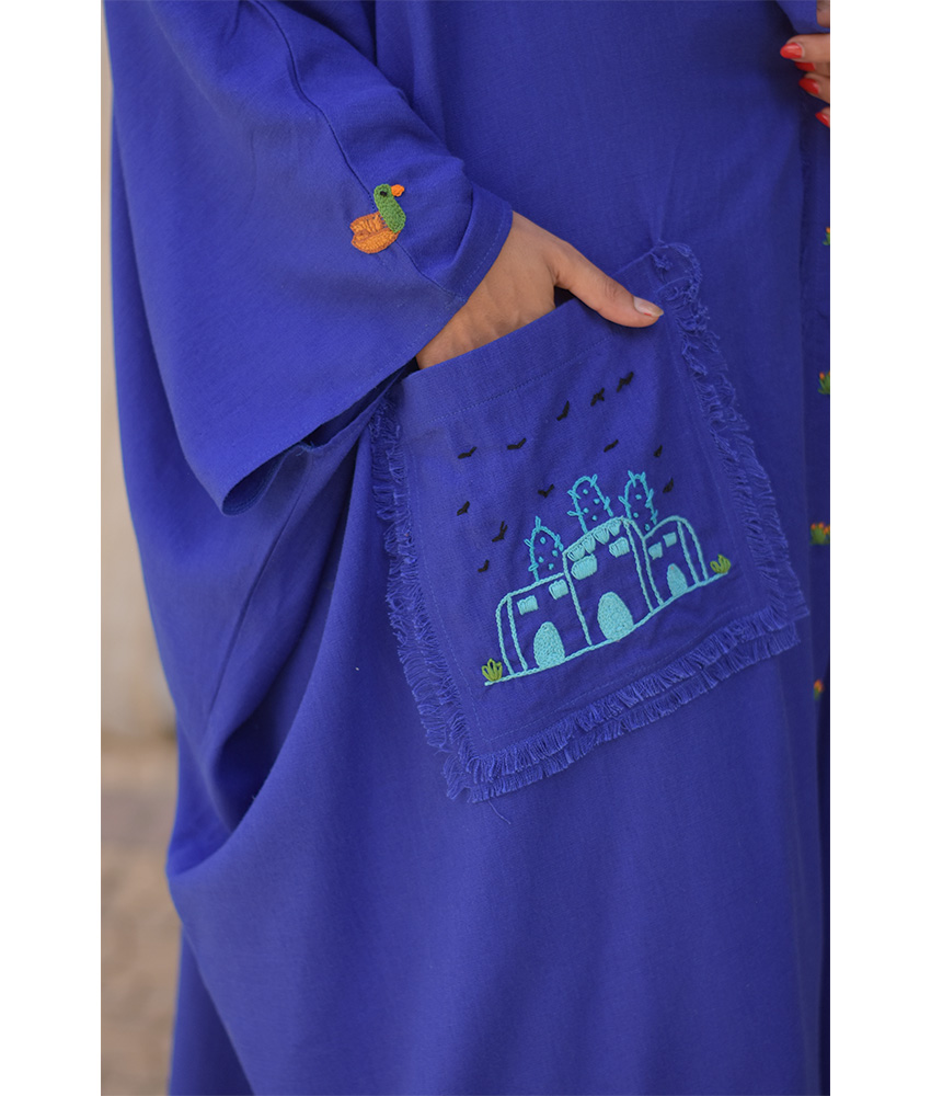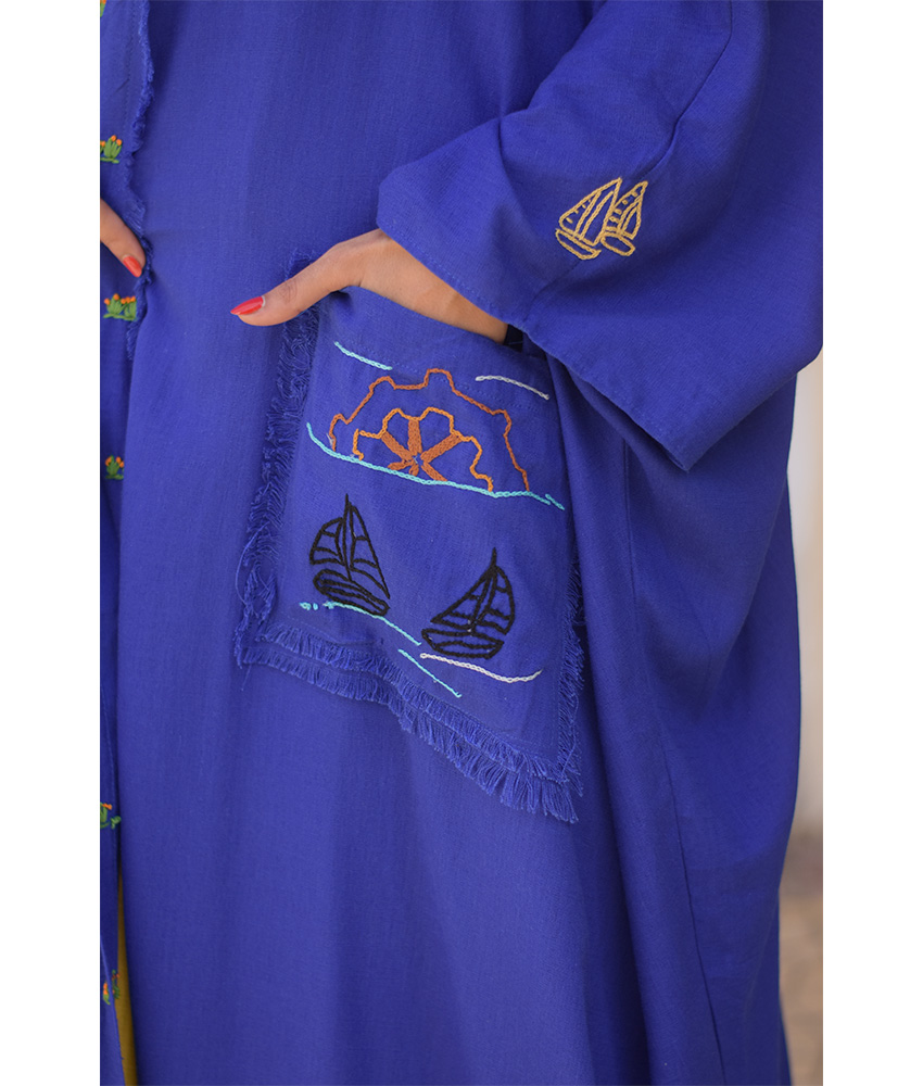 Electric Blue Hand Embroidered Linen Cardigan/Abaya with Hoodie – This gorgeous soft cardigan/abaya is made of linen. It is adorned with the intricate and captivating embroideries by the hands of the talented women of Fayoum. Our cooperation gives them an opportunity to express themselves freely with the needle and helps preserving this beautiful traditional handicraft.