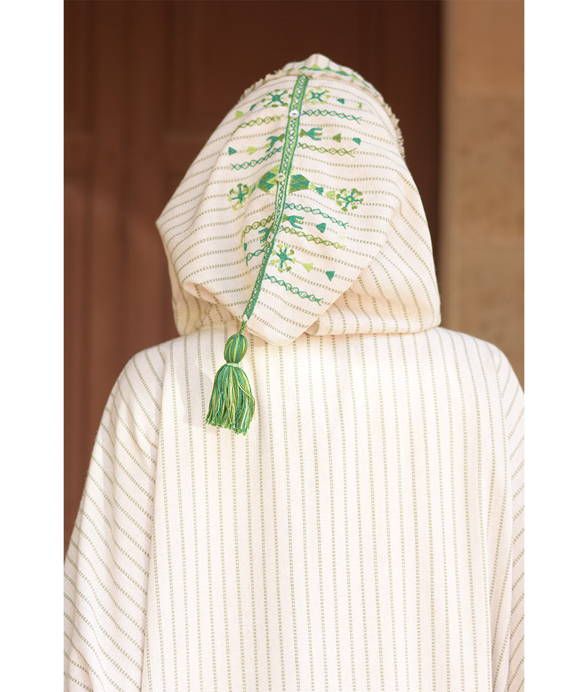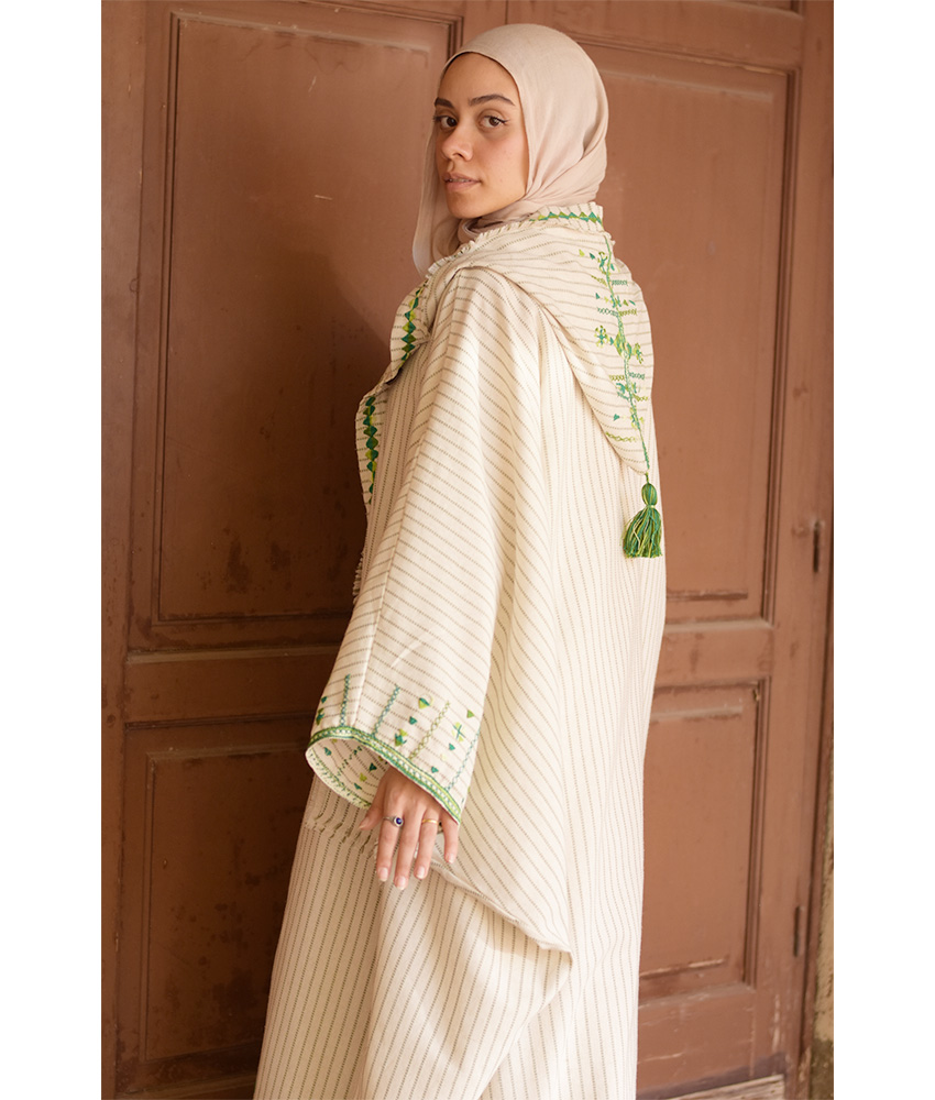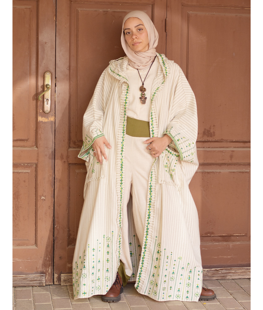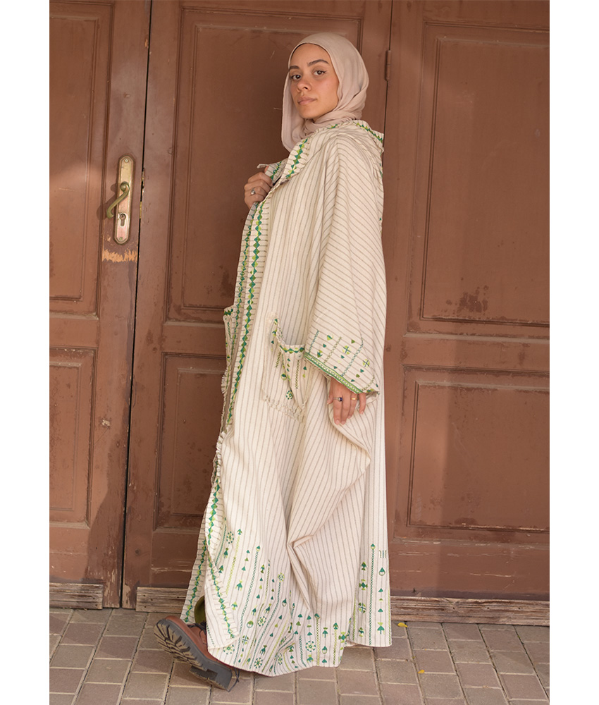 Off White & Green Stripped Siwa Embroidered Heavy Linen Cardigan/Abaya with Hoodie – This gorgeous stripped cardigan/abaya is made of heavy linen. It is adorned with the intricate and captivating embroideries by the hands of the talented women of Siwa. Our cooperation gives them an opportunity to express themselves freely with the needle and helps preserving this beautiful traditional handicraft.