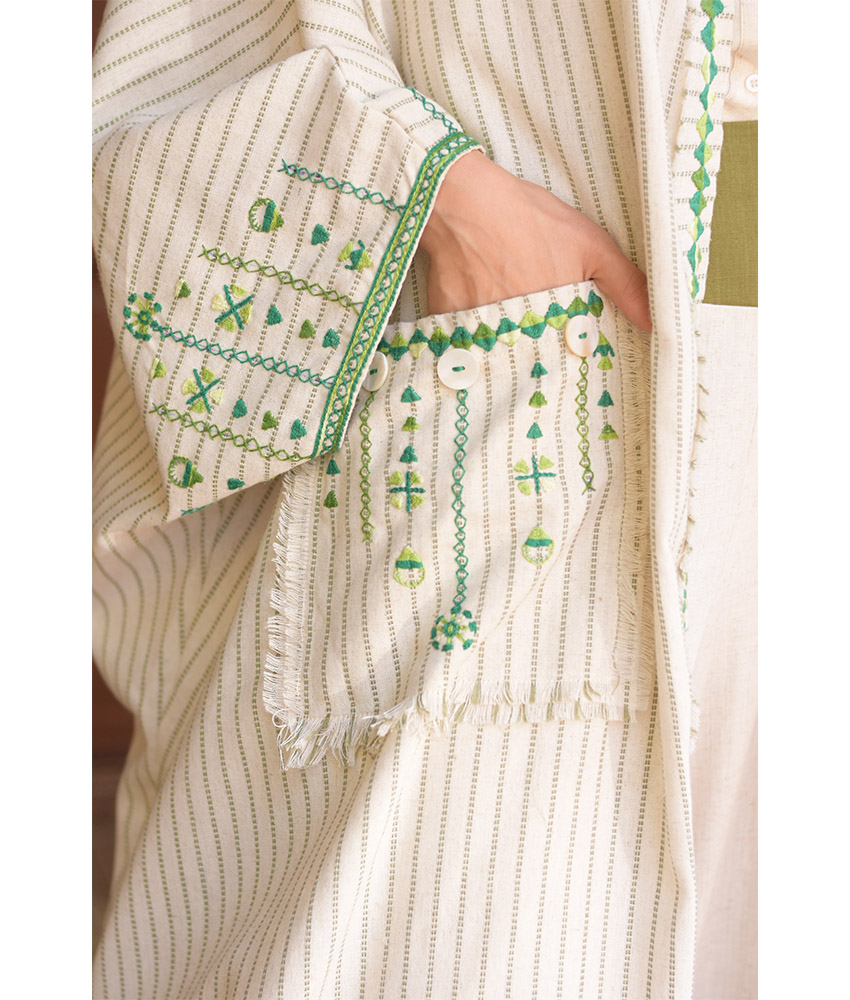 Off White & Green Stripped Siwa Embroidered Heavy Linen Cardigan/Abaya with Hoodie